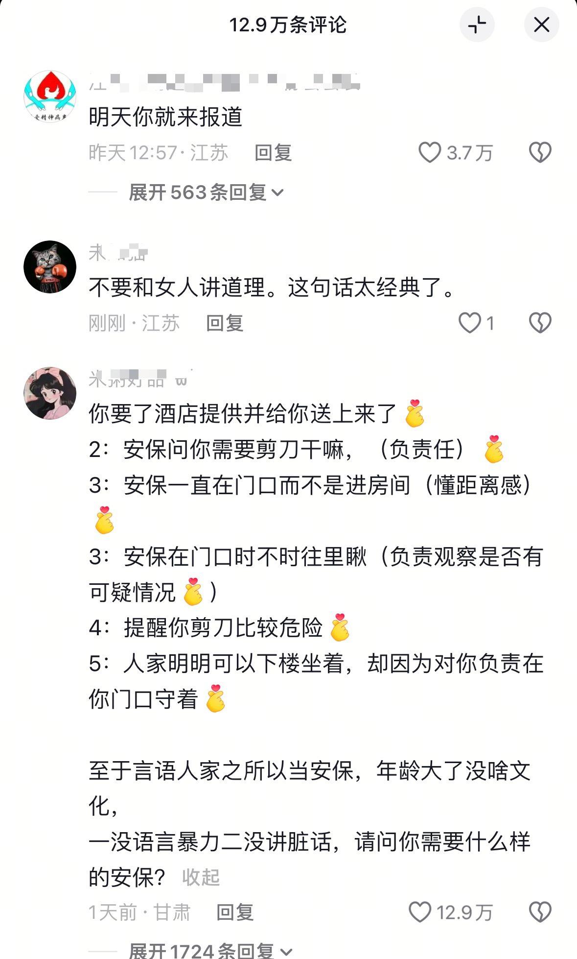 一中年仙女兰州某酒店借剪刀,因为保安在门口守着觉得侵犯了隐私,发视频吐槽。结果12万多条评论,没有一条站她这边的,严重翻车,女滴却心理素质强大,没有舍得删视频,任由网友们自由发挥。基本上酒店是不会借剪刀、水果刀给客人的,要么你拿过去他们给你解决,这是为了安全,是用血的教训换来的。