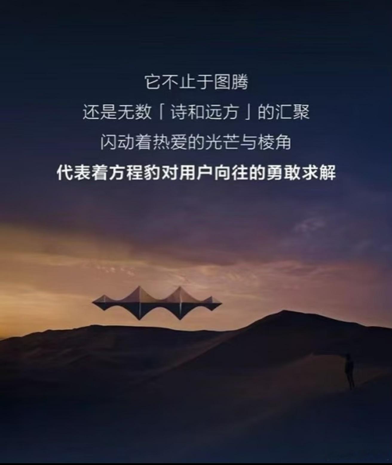p7《工程师之魂》,方程豹logo的官方含义“方程”,是标准和规则,是真实和进取,代表着专业科技;“豹”,是变化和灵动,是野性和放肆,是个性和自由的代名词。两者一张一弛,融合聚变之间创造出新能源个性体验的无限可能。7月14日,方程豹汽车发布品牌 Logo。这一符号从数学的星形线和函数图中提炼元素灵感,整体形态像电波,也宛如山水倒影,是以电之力,求解每个人心里的“诗和远方”今天看到了方程豹的实车,喜欢暖风白 你们捏