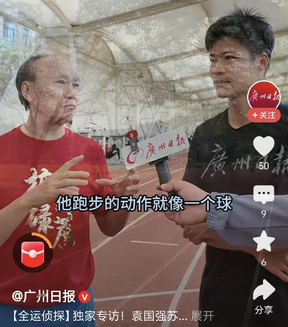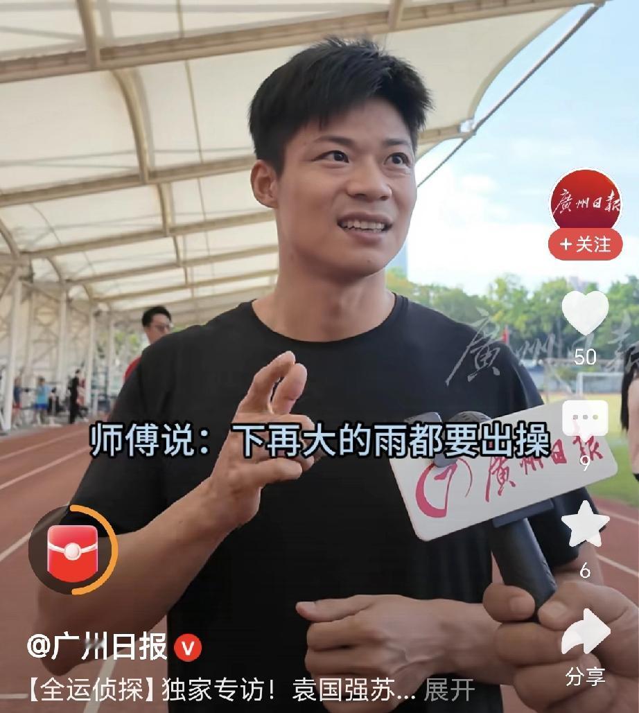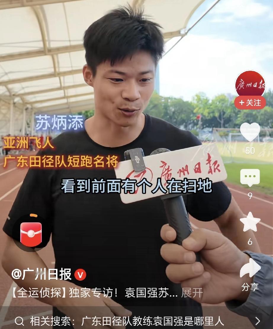 袁国强叫苏炳添为:添哥,苏炳添叫师傅为:扫地人。 袁国强、苏炳添师徒携手再战全运会,独家专访,两人对话太有趣了。 袁国强是苏炳添的师傅,在接受采访时,袁国强说:我叫我徒弟为“添哥”,他的跑步的动作就像一个球。 这可把苏炳添逗乐了,由此可以看出两师徒情深呀。 之后苏炳添又说:那个扫地人就是我的师傅,而且他要求我,无论下多大的雨都要出操训练。 短短的几句话就反应出苏炳添和袁国强师徒关系非常不一般呀。期待广东田径,越跑越劲。