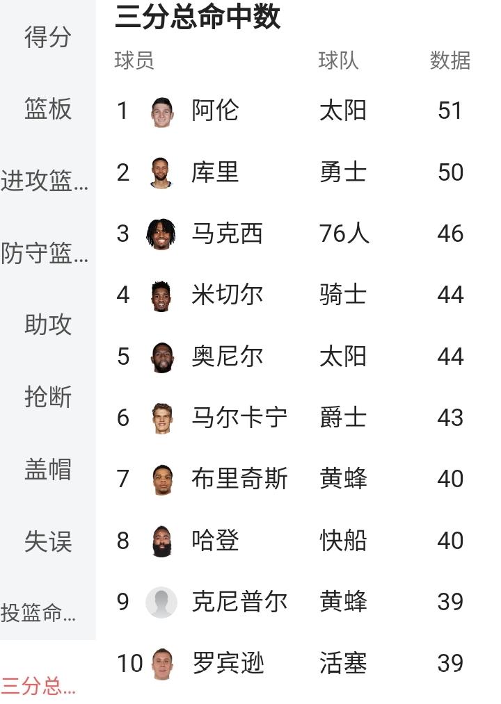 10+场过后,一人超库里,25-26赛季至今三分命中总数最多的10位球员。 格雷森阿伦51记 库里50记 马克西46记 罗伊斯奥尼尔44记 多诺万米切尔44记 马尔卡宁43记 布里奇斯(黄蜂)40记 哈登40记 克尼普尔39记 邓肯罗伯逊39记 在杜兰特、比尔离开后,阿伦成为布克身边最可靠的帮手,赛季目前场均18.5分为生涯新高,而且在三分命中总数上力压库里位列联盟第一,不过本月14日对阵步行者的比赛中受伤,将缺席一段时间,第一的位置不保。 库里近两场比赛可谓大杀四方,而文班亚马成为库里的垫脚石,库里两战马刺完成双杀的同时狂砍95分&命中14记三分球,目前在三分球上以一记之差屈居第2,不过库里场均命中4.5记三分排名联盟第一,再加上阿伦受伤,登顶只是时间问题。 罗伊斯奥尼尔与阿伦一样,杜兰特、比尔离开后,杰伦格林打了两场比赛又受伤,他与阿伦都抓住了机会,打出了生涯最佳表现,奥尼尔目前场均12.2分3.4记三分,三分命中率45.4%,三项数据都是生涯新高。 快船纸面实力很强,但是大多数都是老将,巅峰已过。目前比尔赛季报销,伦纳德养伤,保罗被DNP……,所以到头来又是哈登一人扛起球队。近三战场均39.9分钟,得到33分10.7篮板9助攻,大胡子累的够呛。目前哈登共命中40记三分,命中率达到39.2%,生涯新高。 克尼普尔相信很多球迷都不怎么熟悉,他是黄蜂在2025年以首轮第4顺位选中的新秀。目前场均17.9分,力压状元弗拉格15.2分、榜眼哈珀14.0分,探花埃奇库姆15.6分,位列第一。尤其在三分球上,克尼佩尔特别准,场均命中3.3记三分&40.2%,目前以39记三分与邓肯罗伯逊并列联盟第7。
