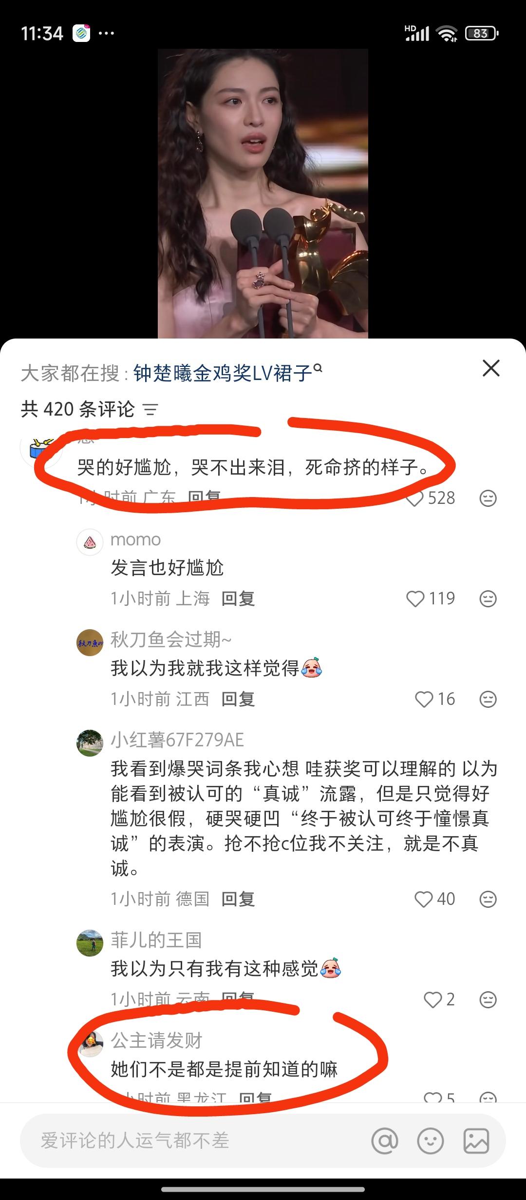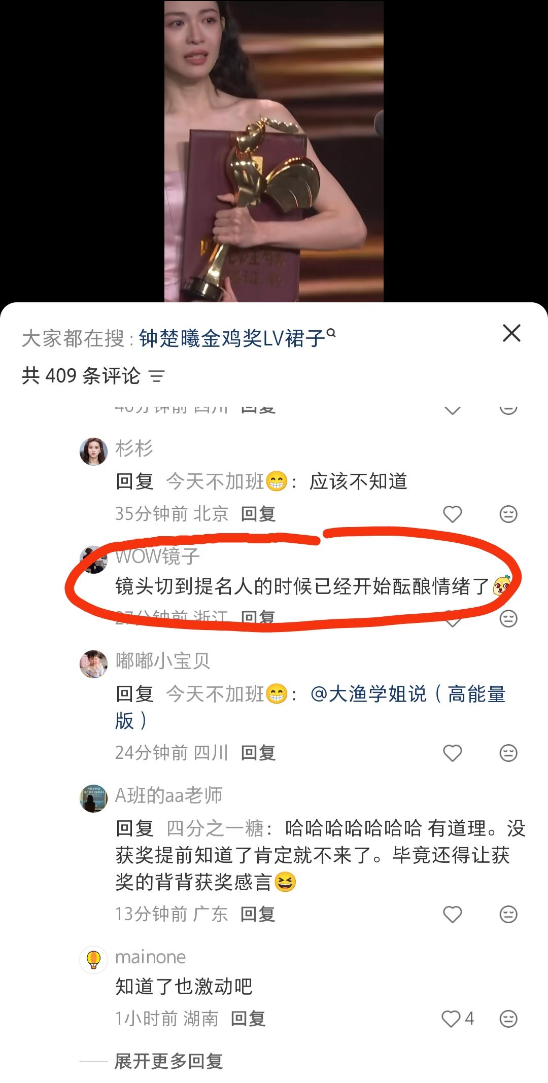 钟楚曦夺得金鸡奖最佳女配,喜极而泣。发表获奖感言的时候也是数度哽咽! 明明是由内而外表现出来的惊喜、激动,情难自已的一系列情感表达。为什么评论区却有这么多的恶意呢?我们看看她们都是怎么说的。 “镜头切到提名人的时候已经在酝酿情绪了”。 “哭的好尴尬,哭不出泪,死命挤的样子”。 …… 人在知道自己获得这样一个重要的奖项的时候,任何夸张的表情也是非常正常的,难道不是吗?