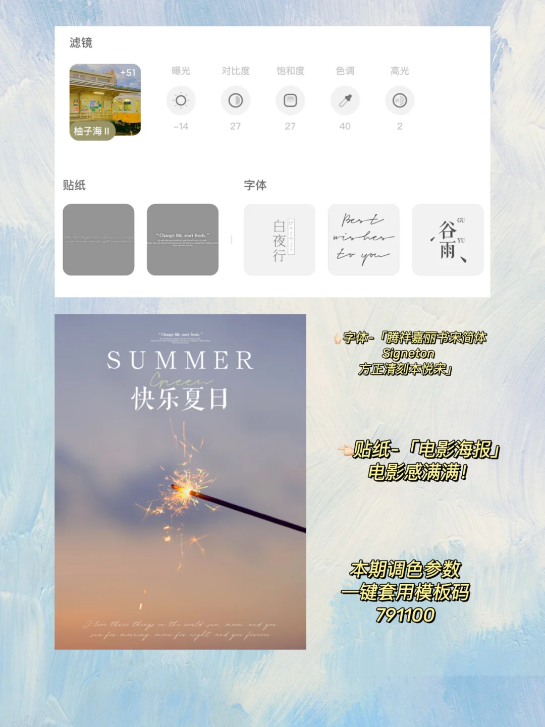 二次构图hin好玩!太拯救废片了!加上海报字体,简直就是高级感满满的海报! . 💻 后期修图教程 黄油相机 滤镜:柚子海Ⅱ+51 曝光-14 对比度+27 饱和度+27 色调+40 高光+2 . 模板码:791100(一键套用) 字体:腾祥嘉丽书宋简体、Signeton、方正清刻本悦宋 贴纸:电影海报 . 手机调色|调色教程|黄油滤镜调色|调色软件 | 滤镜调色教程| 拯救废片 | 手机拍照 | 手机摄影 喜欢我的分享记得👍🏻|⭐收藏|关注哦 我们下一期再见!🤍