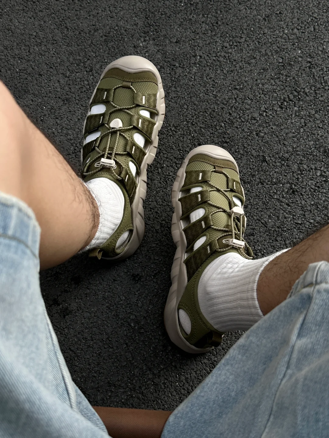 keen的这双hyperport比想象中更百搭一些 轻量化的设计让通勤更轻盈自在, 鞋身颇具先锋时尚感 马提尼橄榄绿搭灰褐色很高级, 为你的穿搭增添一抹亮色的选择 尤其是在夏天为你的双脚披上一层透气的柔软外衣