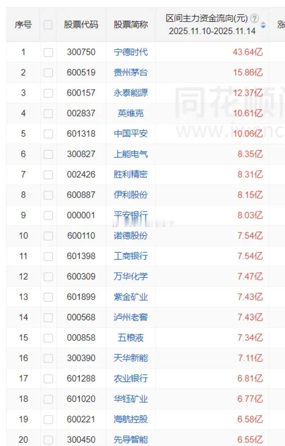 一周主力资金买入前20股1 宁德时代 43.64亿 2 贵州茅台 15.86亿 3 永泰能源 12.37亿 4 英维克 10.61亿 5 中国平安 10.06亿 6 上能电气 8.35亿 7 胜利精密 8.31亿 8 伊利股份 8.15亿 9 平安银行 8.03亿 10 诺德股份 7.54亿 11 工商银行 7.54亿 12 万华化学 7.47亿 13 紫金矿业 7.43亿 14 泸州老窖 7.43亿 15 五粮液 7.34亿 16 天华新能 7.11亿 17 农业银行 6.81亿 18 华钰矿业 6.77亿 19 海航控股 6.58亿20 先导智能 6.55亿