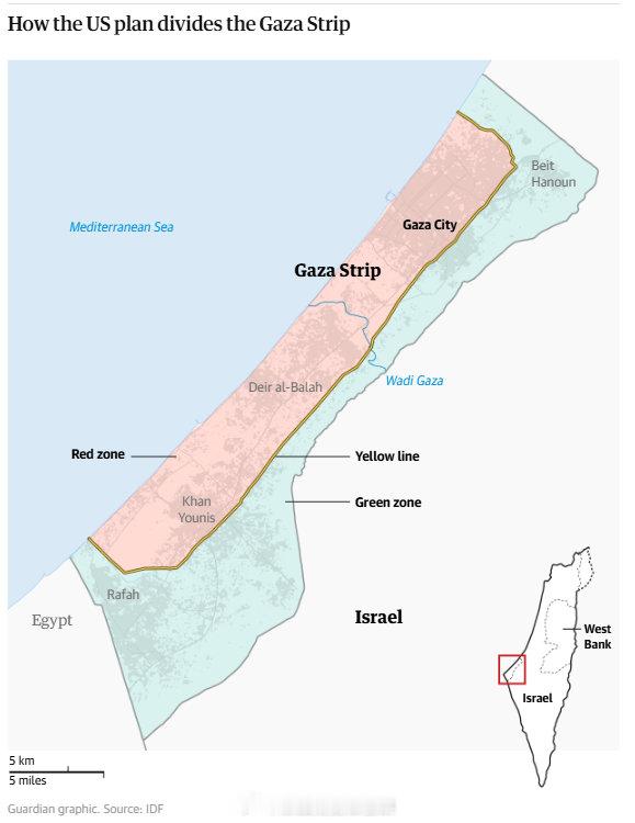 美国正计划对加沙实施长期分区,将其划分为“绿区”和“红区”:“绿区”由以色列和国际部队管理,允许重建;“红区”几乎所有巴勒斯坦人将被迫迁出,不计划进行重建。一支拟议的国际维稳部队最初只会部署在绿区,与以色列部队并行行动,加沙将继续沿着以色列目前的“黄色控制线”被划分。来源及地图:《卫报》