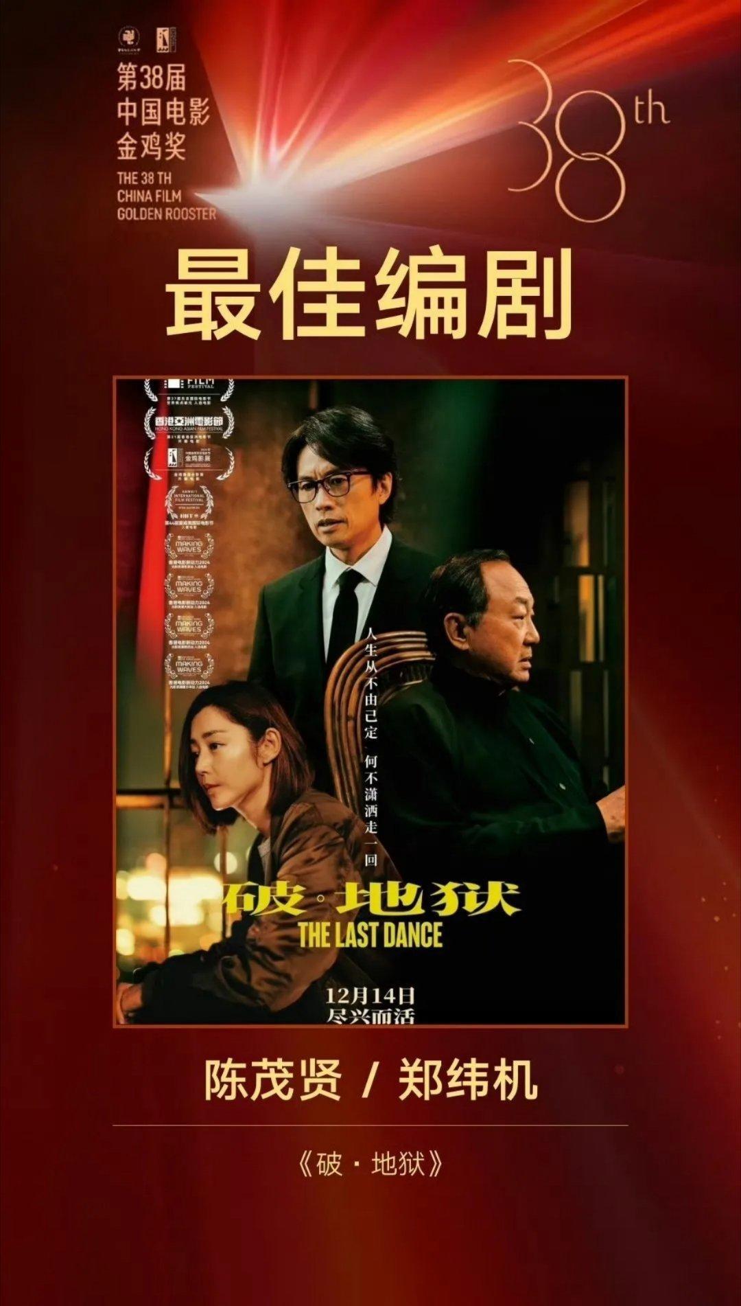 第38届中国电影金鸡奖完整获奖名单:最佳故事片:邵艺辉《好东西》评委会特别奖:陈凯歌《志愿军:存亡之战》最佳导演:陈思诚、戴墨《唐探1900》最佳男主角:易烊千玺《小小的我》最佳女主角:宋佳《好东西》最佳女配角:钟楚曦《好东西》最佳男配角:袁富华《水饺皇后》最佳编剧:陈茂贤、郑纬机《破•地狱》最佳摄影:赵非《志愿军:存亡之战》最佳音乐:翟景彦《长安的荔枝》最佳美术:韩忠、马晓飞《解密》最佳剪辑:周新霞《我和我母亲的疼痛》最佳录音:王丹戎《志愿军:存亡之战》最佳外语片:《还有明天》最佳纪录片:《您的声音》最佳导演首作:高朋《老枪》最佳中小成本故事片:《但愿人长久》最佳戏曲片:《双蝶扇》最佳美术片:《哪吒之魔童闹海》最佳儿童片:《闪耀少年之空中接力》 中国文联终身成就奖:乔榛 (配音演员/配音导演)、肖桂云(《开国大典》导演)