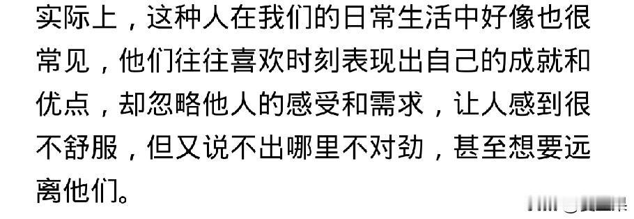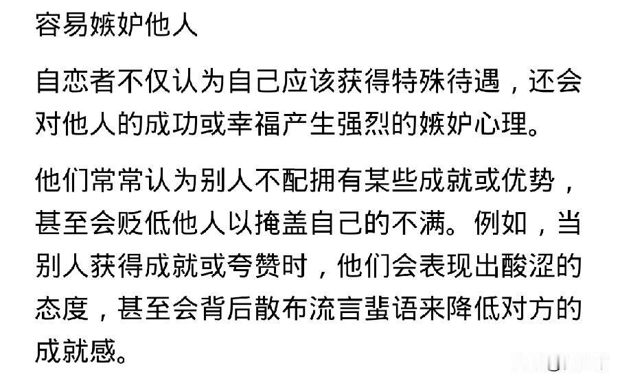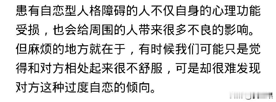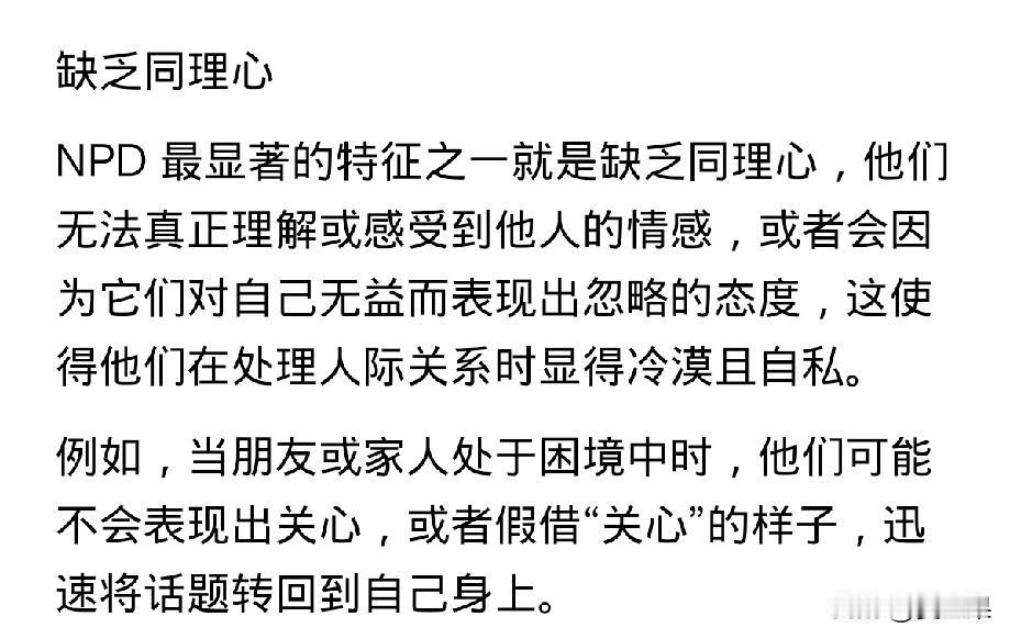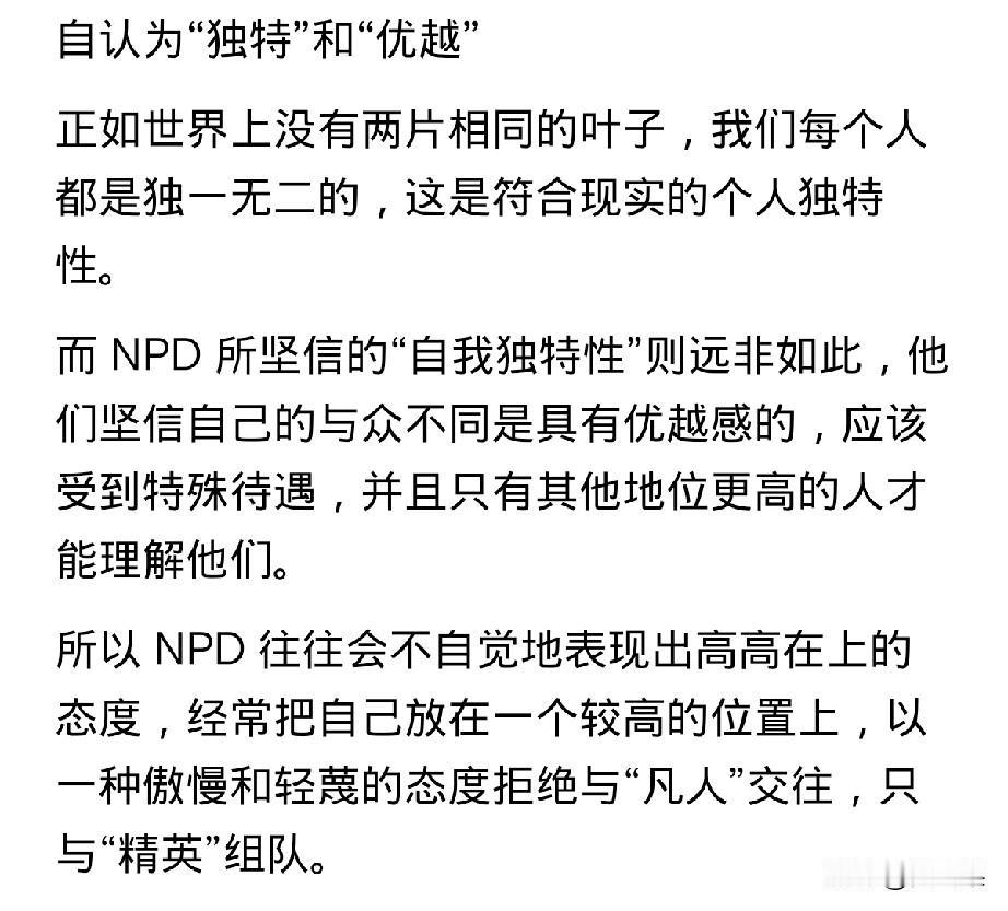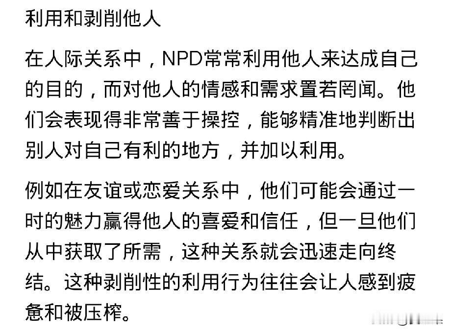 第一次听到NPD这个词, 是一位同事说的,当时她在描述另一个人人。 她说,你知道NPD吧,谁谁谁就是这类人,她口中的谁谁谁,目前是她生命中遇到的一位强有力的敌人和对手。 我说不知道NPD,她说就是自恋型人。 我恍然大悟,自恋型人早就听说过,只是不很清楚。 我又查了查,发现一个很可笑的事。 就是这位同事说别人NPD,实际上她就是一个NPD很严重的人。 逐一对照: 1、与NPD人格的人相处,你会感到不舒服,但也说不出来。 跟这位同事相处就是这样,可能是一句话,也可能是一个表情,反正是不舒服,碍于同事面子没向她说过。 2、NPD的人喜欢搞小团体。 说得太对了,这位同事就是搞小团体的一把好手,她在通过搞小团体向你证明,她有多么强大的能力可以孤立你。 3、NPD人善于利用剥削别人。 真是一语中的,这位同事自己很少动手,通过小恩小惠或者强压手段驯服你成为她听话的奴才,公事私事都按她说得做,帮她的忙,年轻的新来的难免在她手下干着被卖了还替她数钱的事。当然还证明了她还是个pua高手。 4、NPD容易嫉妒他人,缺乏同理心,认为自己独特优越感十足…… 一一对应,跟这位同事全能对上。 现在,她还学了法律,拿到了律师资格证,不但更有优越感,还套用律师录音留证的那一套,动不动就录音。 真的好可怕,跟她相处的每一天如履薄冰,说每一句话都要考虑再三,如果有一丁点儿办法就不想见她。 所以,她说别人,她眼中的那个对手,可能也是这样,那真是针尖对麦芒,棋逢对手了,两者能不能决出胜负,拭目以待。
