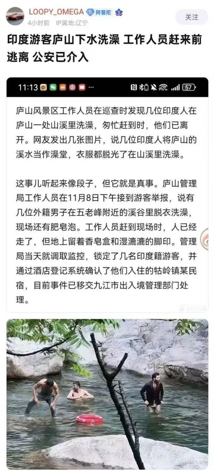 印度人庐山景区洗澡上热搜了。 这事儿最让人生气的,是“规则被当成了空气”——庐山景区的“禁止下水”警示牌(还是中英文的)就立在那儿,救生圈是应急工具不是玩具,结果这几位印度游客不仅脱衣搓澡、留下肥皂泡污染溪水,连旁人劝阻都当没听见,活脱脱把世界遗产地当成了自家澡堂。 “文化差异”从来不是违规的遮羞布。就算印度有在公共水域洗浴的习俗,到了其他国家的景区,也得守当地的规矩——就像咱们去印度不会在恒河乱丢垃圾,尊重是相互的,规则更是不分国籍的底线。 更该较真的是“管不管得住”。景区的巡查疏漏是一方面,但涉事游客已经被锁定身份,现在就该按《风景名胜区条例》罚到位,该罚款罚款、该记录不良行为就记录——只有让违规者付出代价,才能真的守住公共空间的秩序,不然“恒河分河”的闹剧只会越来越多?