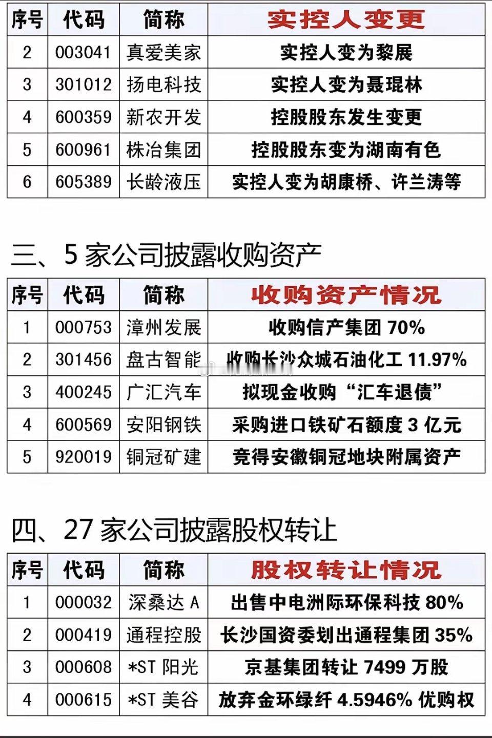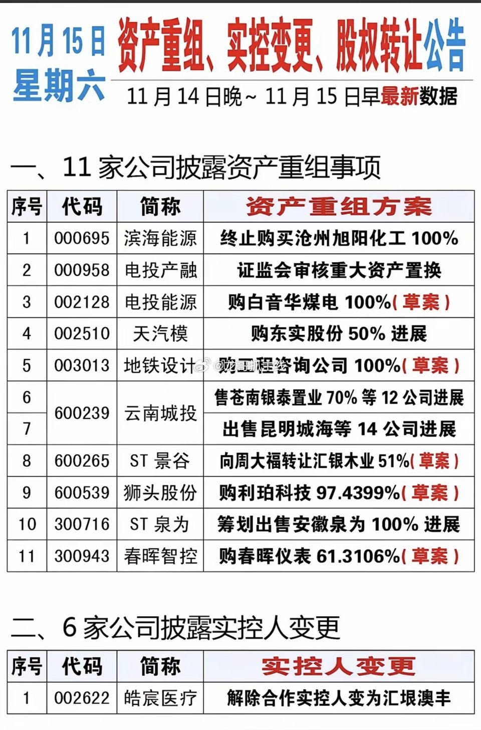 11月15日最新资产重组、实控变更、股权转让公告!11家公司披露资产重组,5家收购资产27家股权转让。股权转让的,有可能在转让前炒作一波,就看是否在低位了。