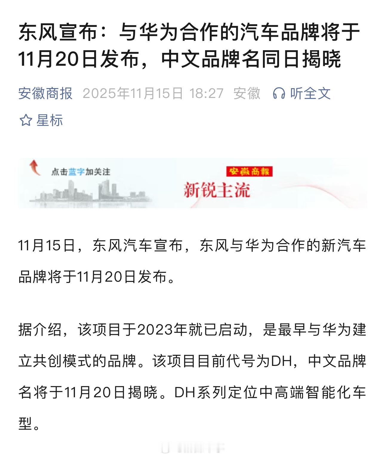 11月15日,东风汽车宣布,东风与华为合作的新汽车品牌将于11月20日发布。