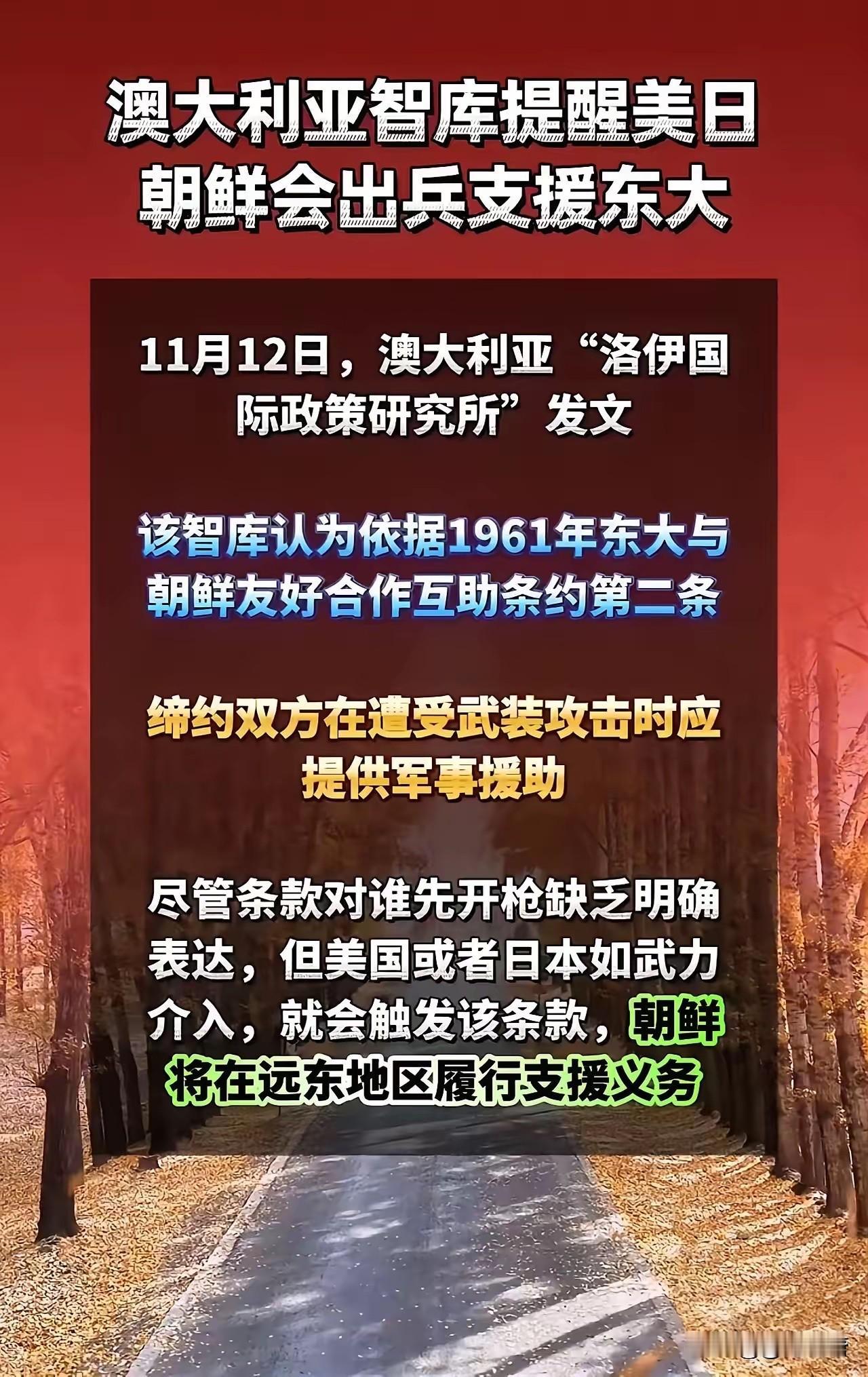 澳大利亚智库提醒:如日本武力介入台海,朝鲜必参战!日本武力介入将会自动触发《中朝友好合作互助条约》中的共同防御条款。 1961年生效的《中朝友好合作互助条约》可不是摆设,明确写着一方遭武装进攻,另一方必全力援助,现在都自动续到2041年了。 朝鲜本就对日本军国主义恨之入骨,早就放话要讨还历史血债,日本武力介入台海,刚好撞在枪口上。 真以为有美国撑腰就能为所欲为?这可不是单挑,是同时对上两个硬茬。台海是中国核心利益红线,再加上中朝同盟的刚性加持,挑衅者注定是自讨苦吃。 现在的日本是真没看清局势,还是被右翼带偏了?你们觉得日本敢真的迈出那危险一步吗?
