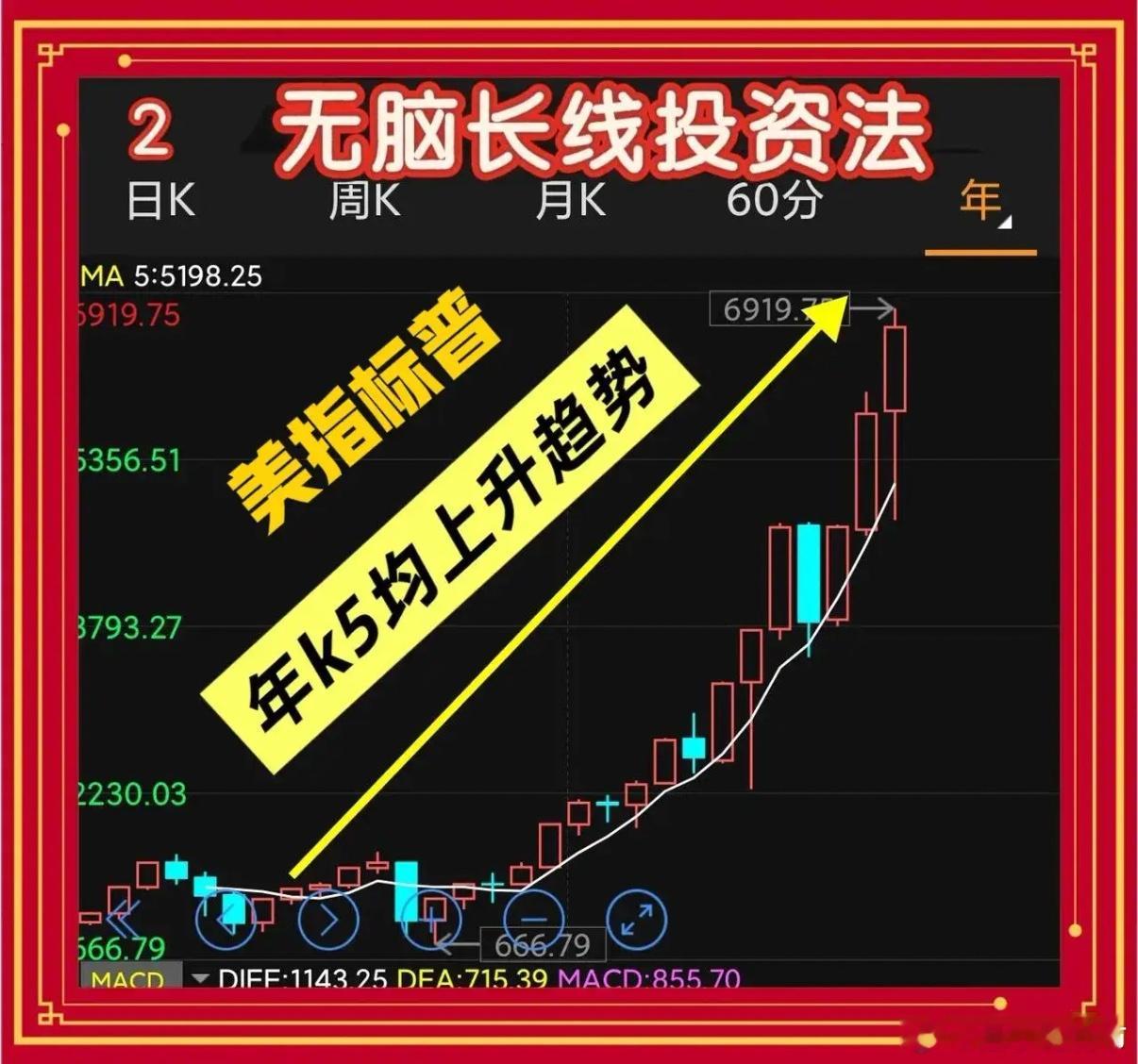 “无脑”执行的高胜率炒股方法适合长线投资不愿盯盘的股民第一条 选标的,先问自己一句:200年后它还在吗?把“大概率一直存在”当唯一硬门槛。美股、黄金、越南指数、比特币皆可,只挑你真心相信能跑赢其余的品种。不信任就跳过,别委屈自己的睡眠。 第二条 资金分仓,永远留10%“手痒仓”可动用投资资金先计划出10%,专门满足看盘冲动,打板、杠杆、网格随你折腾。余下90%才进入“无脑投资条款”,确保主仓不受情绪污染。 第三条 按 年龄配置行业指数,只看年K线和M5均线打开全球指数,比如,标普500与纳斯达克的年K,找到M5均线。 - 20岁:配置20%标普(分红)指数+80%纳指(科技) 指数 - 30岁:30%标普(分红)指数+70%纳指(科技)揩数依此类推(自己按认知调整)当K线触碰M5当日,把可投资金的50%一次性打完;未触碰就空仓等待,平时不必盯盘,听说“美股暴跌”再瞄一眼即可。 第四条 选取 巨无霸个股,只看日K和M120选全球家喻户晓的“超级巨无霸”,打开日K,找到M120均线。 - 股价低于M120 15%:首笔投入20%资金 - 若再跌20%:补加20%资金同一行业只选一家,最多五家分散。银行、食品、金融各挑一名即可,再多无益。 第五条 止盈没有标准,哪怕赚1点也是赚主仓不设固定止盈,真懂技术者等“技术面走坏”再跑;胆小者赚5%可撤,正常者赚10%可撤。记住:无脑策略不拼排名,只拼睡得着。 第六条 上升趋势才有效,退市风险自己排任何标的先自问:“它会永远存在吗?”答案若犹豫,立即剔除。买入后若进入下降趋势,暂停补仓,等待重回上行通道。 第七条 机会成本交给那10%主仓按条款机械执行,其余交给“手痒仓”。拉长十年,既能享受复利,又能保留操作快感,长期看收益与情绪双平衡。 第八条 不比较、不纠结、不学习也能做别人苦读财报、回测数据,拿下50%收益;你无脑执行拿20%,理应知足。想超额回报,请转量化赛道;要简单人生,请回到条款。 第九条 自己资金自己负责任何条款只是思路交流,不构成投资建议。入市前请独立评估风险,确保亏损不影响生活。 若这条“无脑”高胜率投资对你胃口,欢迎点赞、关注、评论、收藏、转发,让更多厌倦盯盘的朋友也能睡得香。温馨提示:本文仅供思路交流,不做投资推荐。股市有风险,入市需谨慎。