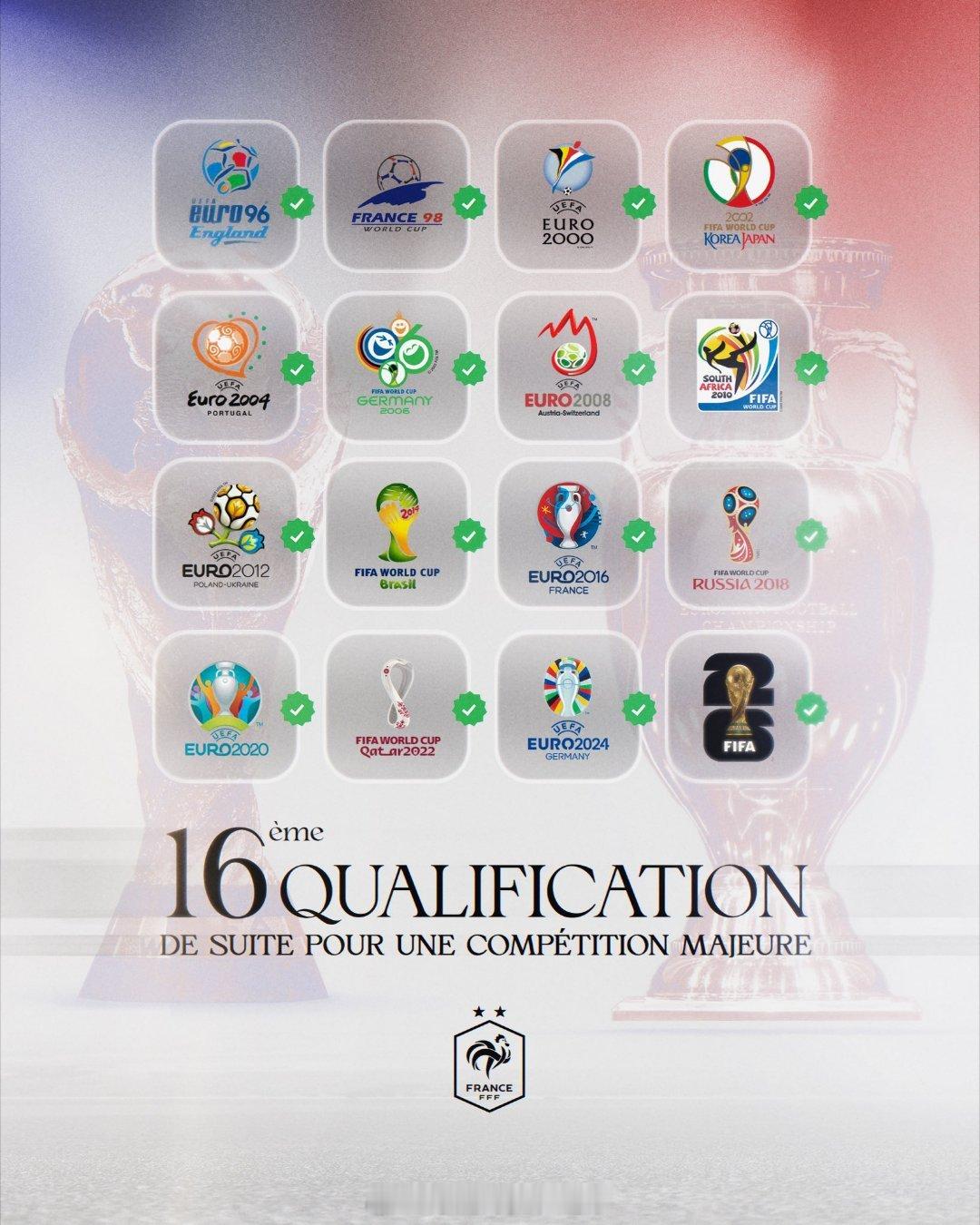 法国队着周再次不负众望,成功拿到连续第1️⃣6️⃣次晋级重大赛事(欧洲杯+
