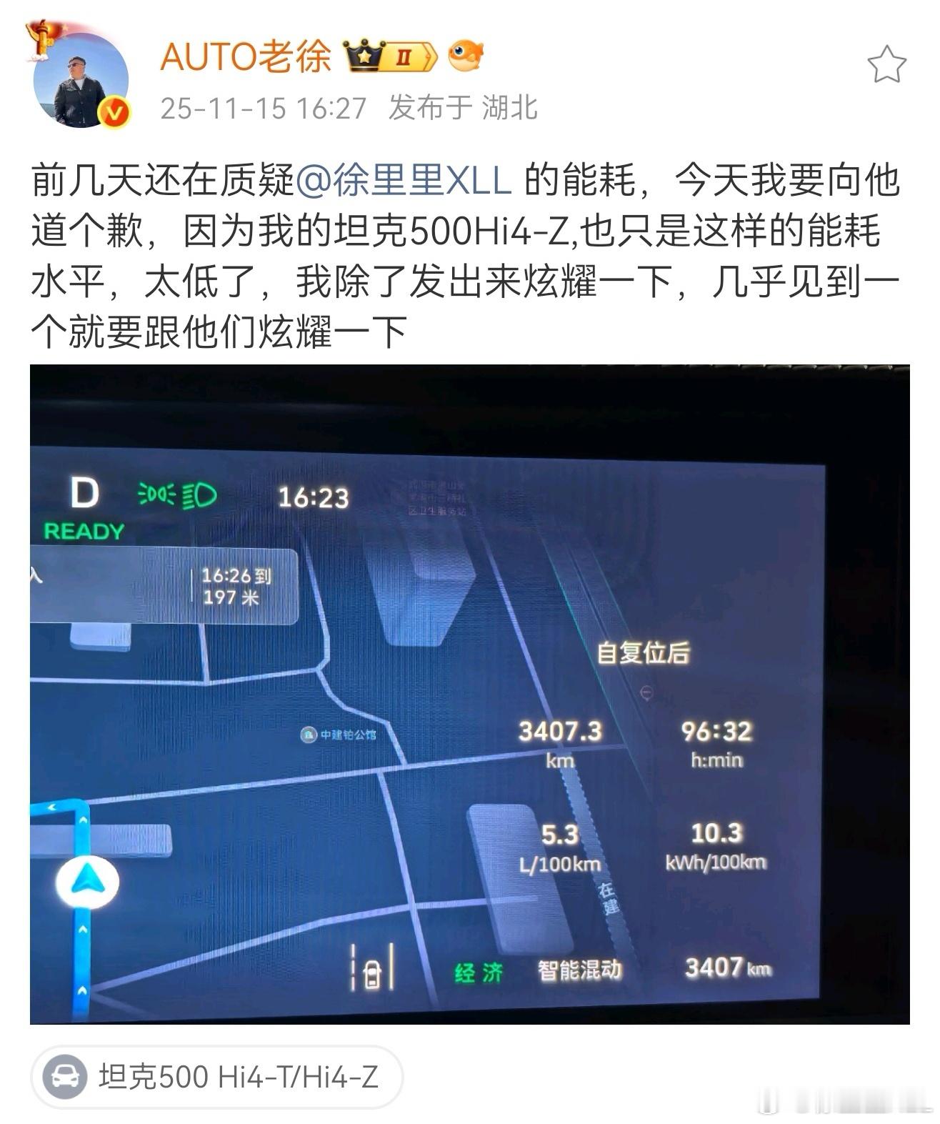 哥,你这完全不行啊...图2,我纯电模式,电耗13.9。图3,纯亏电状态,油耗6.9。图4,油电混合状态,3.4个油+10.9度电。 哥,你怎么能耗这么高啊...