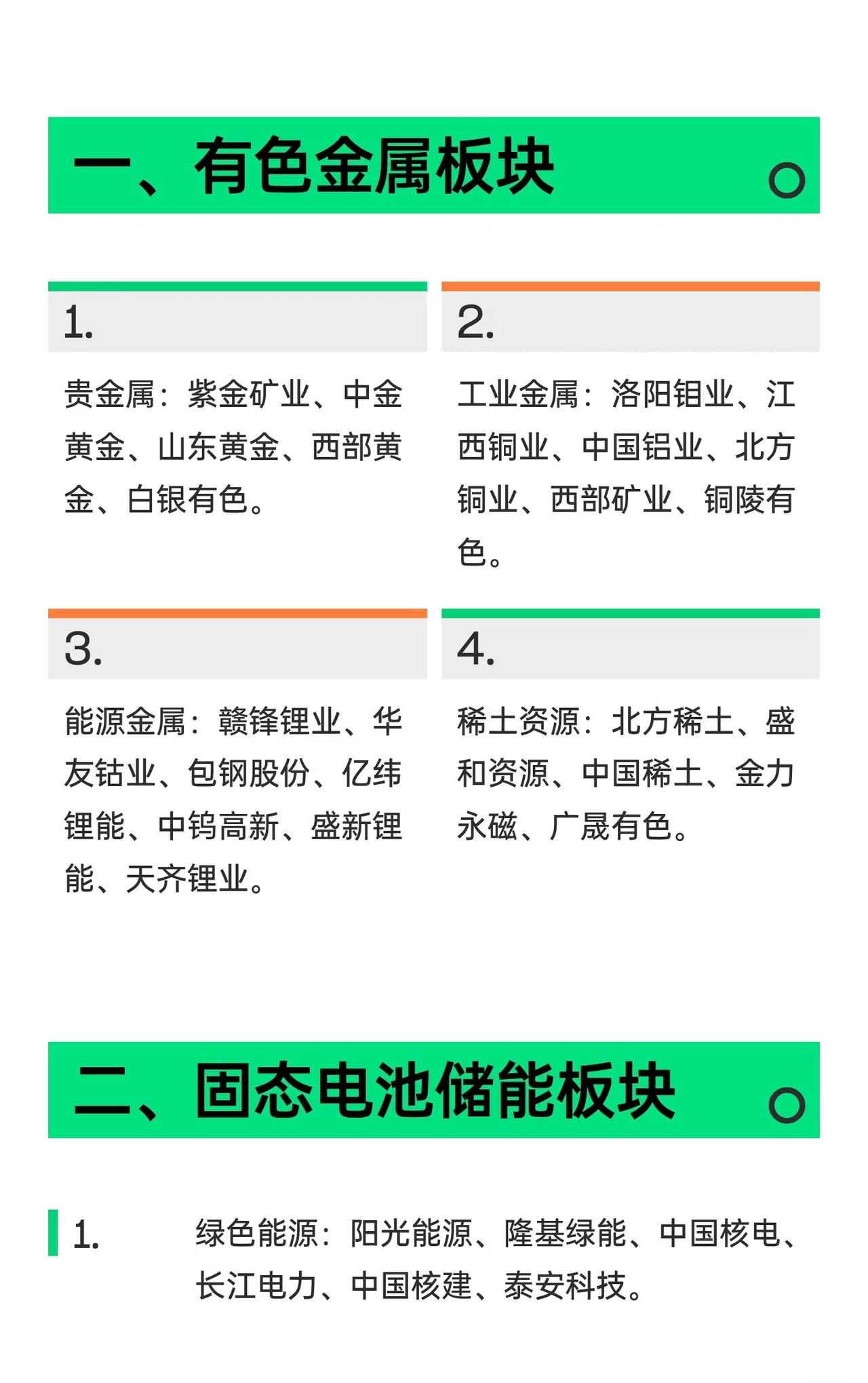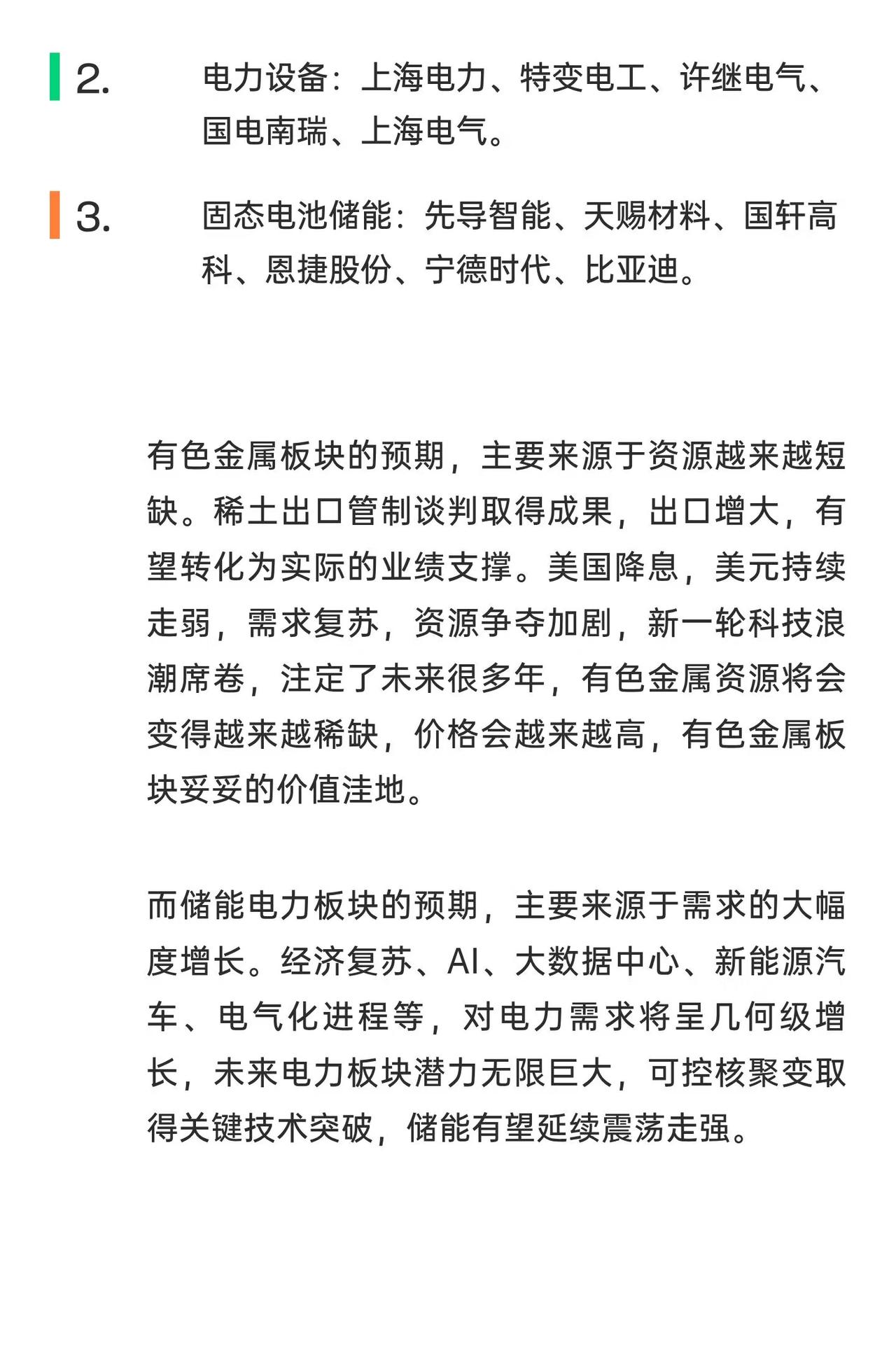 1. 核心主题:当前调整趋势中,有色金属(资源稀缺+新能源需求)和储能(固态电池/电力设备)板块具备高成长性,是价值洼地。 2. 关键驱动: - 有色金属:资源稀缺(稀土管制放松、美元走弱)、新能源(储能/AI/电气化)推高需求,价格看涨。 - 储能电力:经济复苏、AI/数据中心/新能源汽车爆发式用电需求,叠加可控核聚变技术突破,板块潜力大。 3. 重点企业: - 有色:紫金矿业(贵金属)、洛阳钼业(工业金属)、赣锋锂业(能源金属)、北方稀土(稀土)。 - 储能:阳光能源(绿色能源)、宁德时代(电池)、特变电工(电力设备)。 结论:两大板块受益于资源稀缺性与能源转型,长期成长逻辑明确。