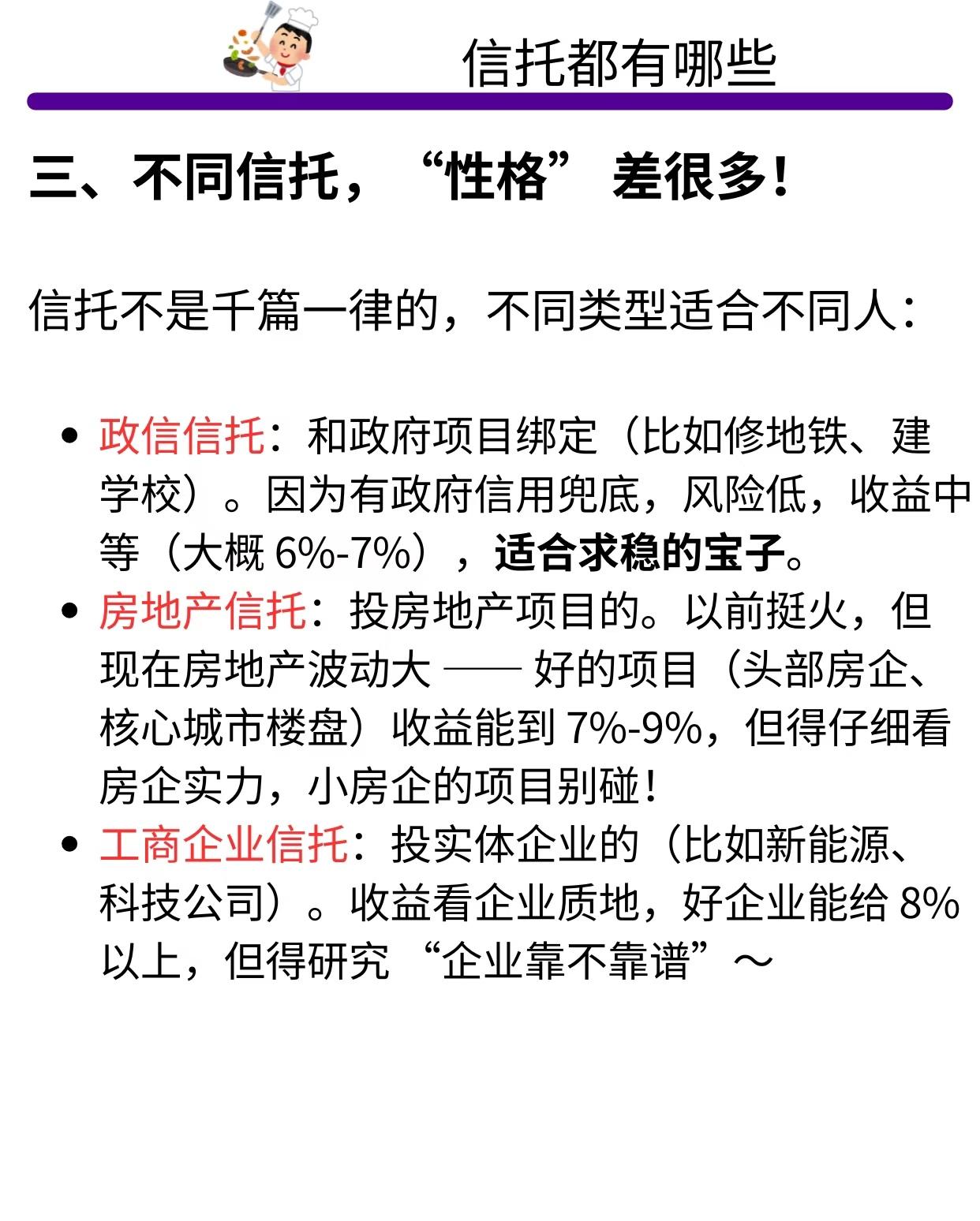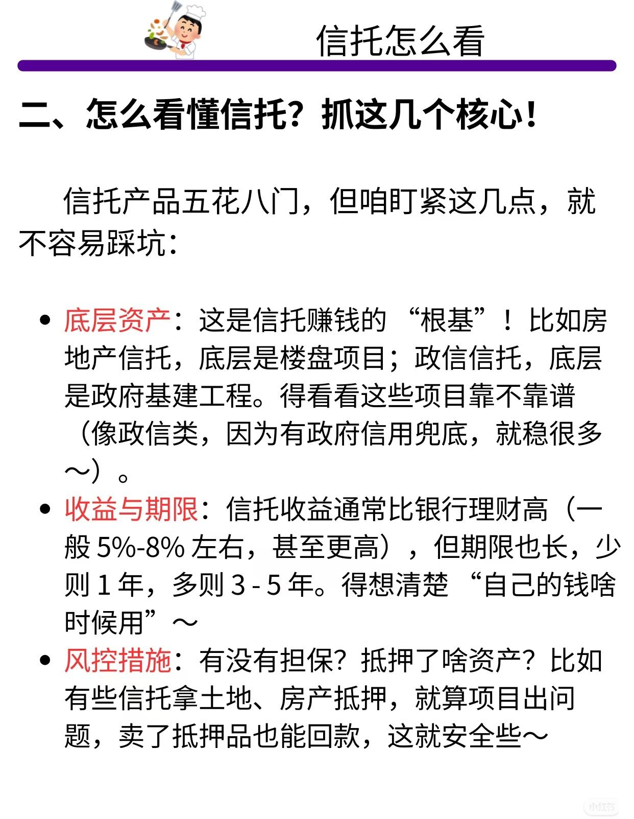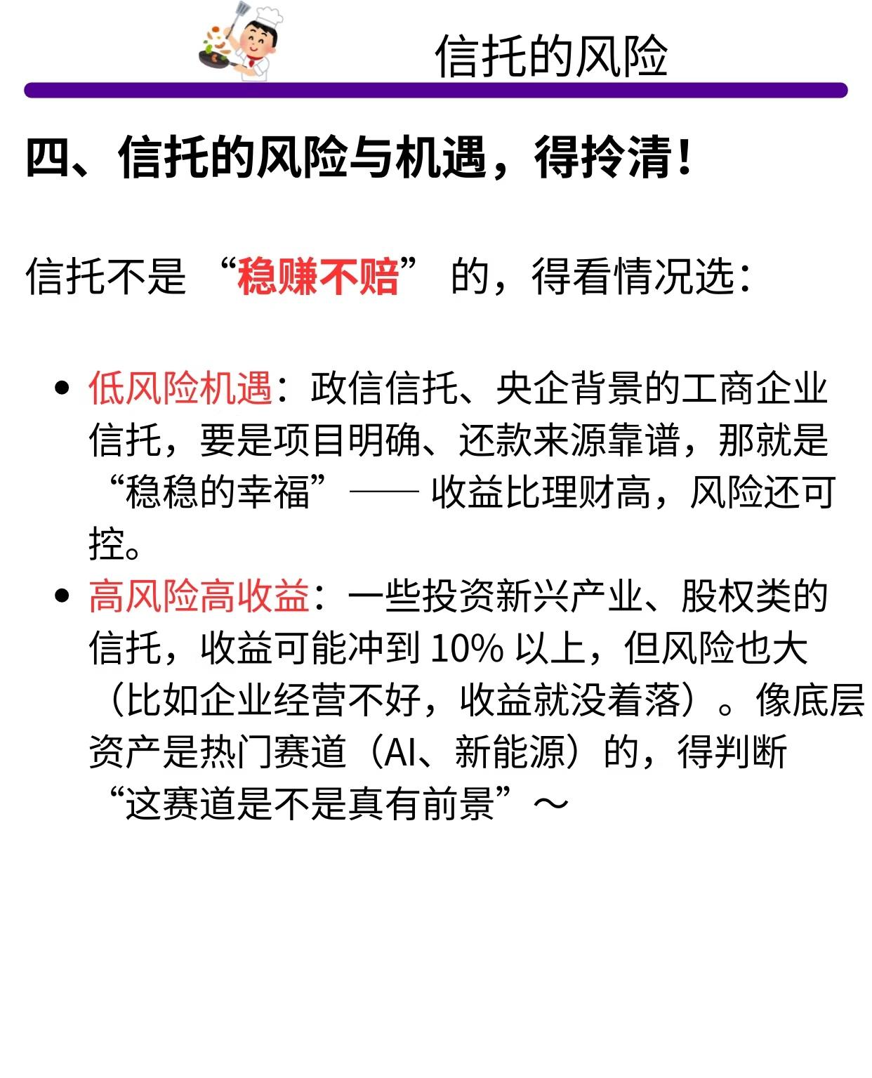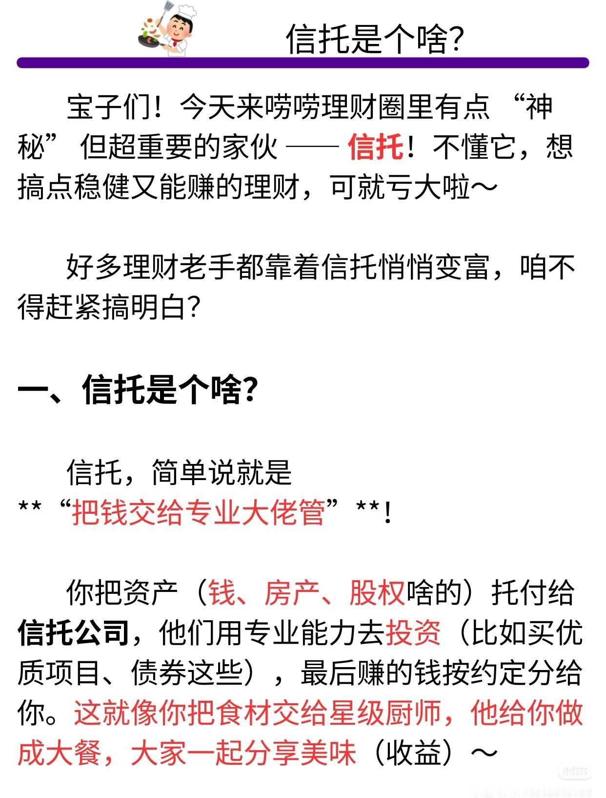 “信托”理财知识的系列图解 🔷 一、信托是个啥?(基础概念) 信托是一种“把钱交给专业机构(信托公司)打理”的理财工具,类似于你把食材交给专业厨师,由其投资于优质项目(如房地产、政府工程、企业等),最终按约定把收益分配给你。它属于理财圈相对“神秘”但专业的工具,能帮助实现稳健又可能较高的收益。 🔷 二、怎么看懂信托?(核心关注点) 挑选信托产品时,主要看3个关键要素: 1. 底层资产:钱具体投到哪里?比如房地产项目、政府基建、还是企业。政信类(政府相关)通常因为有政府信用背书,相对较稳。 2. 收益与期限:信托收益普遍高于银行理财(一般在5%甚至更高),但投资期限也较长(1-5年),需考虑资金的流动性需求。 3. 风控措施:有无土地、房产等资产抵押,或担保等保障机制,这些能提高投资安全性。 🔷 三、不同信托,“性格”差很多!(常见类型与特点) 信托产品并非千篇一律,主要分为三大类,各有不同的风险和收益特征,适合不同风险偏好的投资者: 1. 政信信托(政府项目,如修地铁、建学校): - 特点:有政府信用兜底,风险较低,收益中等(约6%); - 适合人群:偏好稳健的投资者(文中称“求稳的宝子”)。 2. 房地产信托(投资房地产项目): - 特点:曾经很火,但目前市场波动大。优质项目(如头部房企、核心城市楼盘)收益可达7%,但需谨慎筛选开发商,避开小房企项目。 - 风险提示:小房企或市场下行期项目风险较高。 3. 工商企业信托(投资实体企业,如新能源、科技等): - 特点:收益看企业实力,优质企业项目收益可达8%甚至更高,但需仔细研究企业是否靠谱。 - 提醒:企业质地参差不齐,投资前要做足功课。 🔷 四、信托的风险与机遇,得拎清!(风险与收益权衡) 信托并非“稳赚不赔”,投资前必须分清风险等级: - 低风险机遇:如政信信托、央企背景的工商企业信托,如果项目清晰、还款来源可靠,那么收益高于普通理财,同时风险相对可控,属于“稳中求进”的选择。 - 高风险高收益:如投资新兴产业(如AI、新能源)、股权类信托,收益可能超过10%,但风险也大,一旦底层企业经营不佳,收益可能落空。这类信托需要投资者对行业前景有较好判断力,适合风险承受能力较强的投资者。 ✅ 总结建议: 信托是一种灵活且潜在收益较高的理财方式,但并非适合所有人。投资前要弄清楚: 1. 你投的是什么(底层资产)? 2. 你的钱多久能拿回来(期限)? 3. 有什么保障措施(风控)? 4. 你适合哪种风险类型的产品? 根据自身风险偏好和资金安排,选择“性格”匹配的信托产品,才能在控制风险的前提下,追求更理想的收益。