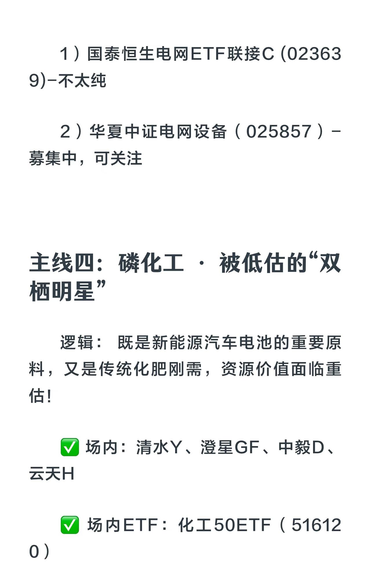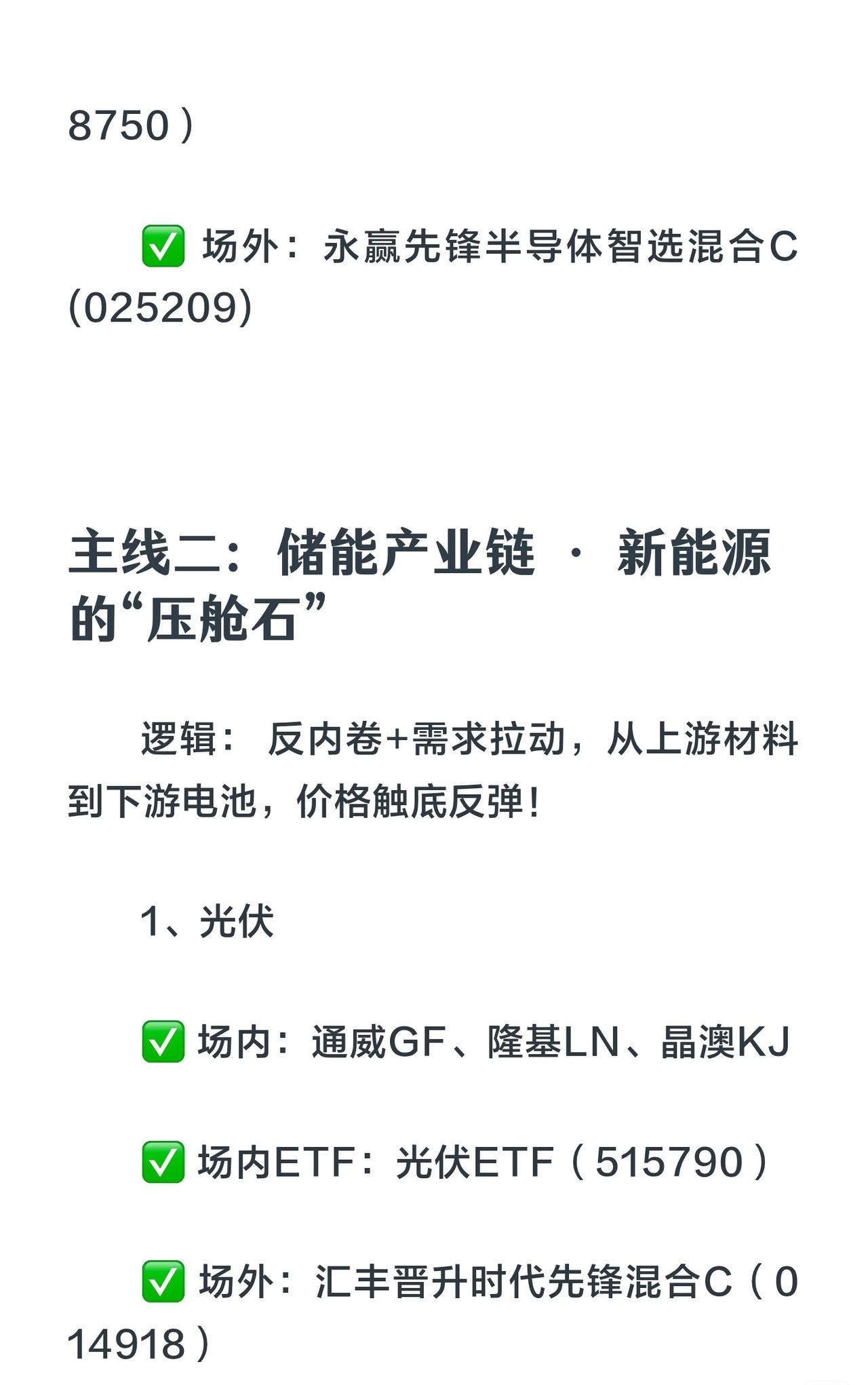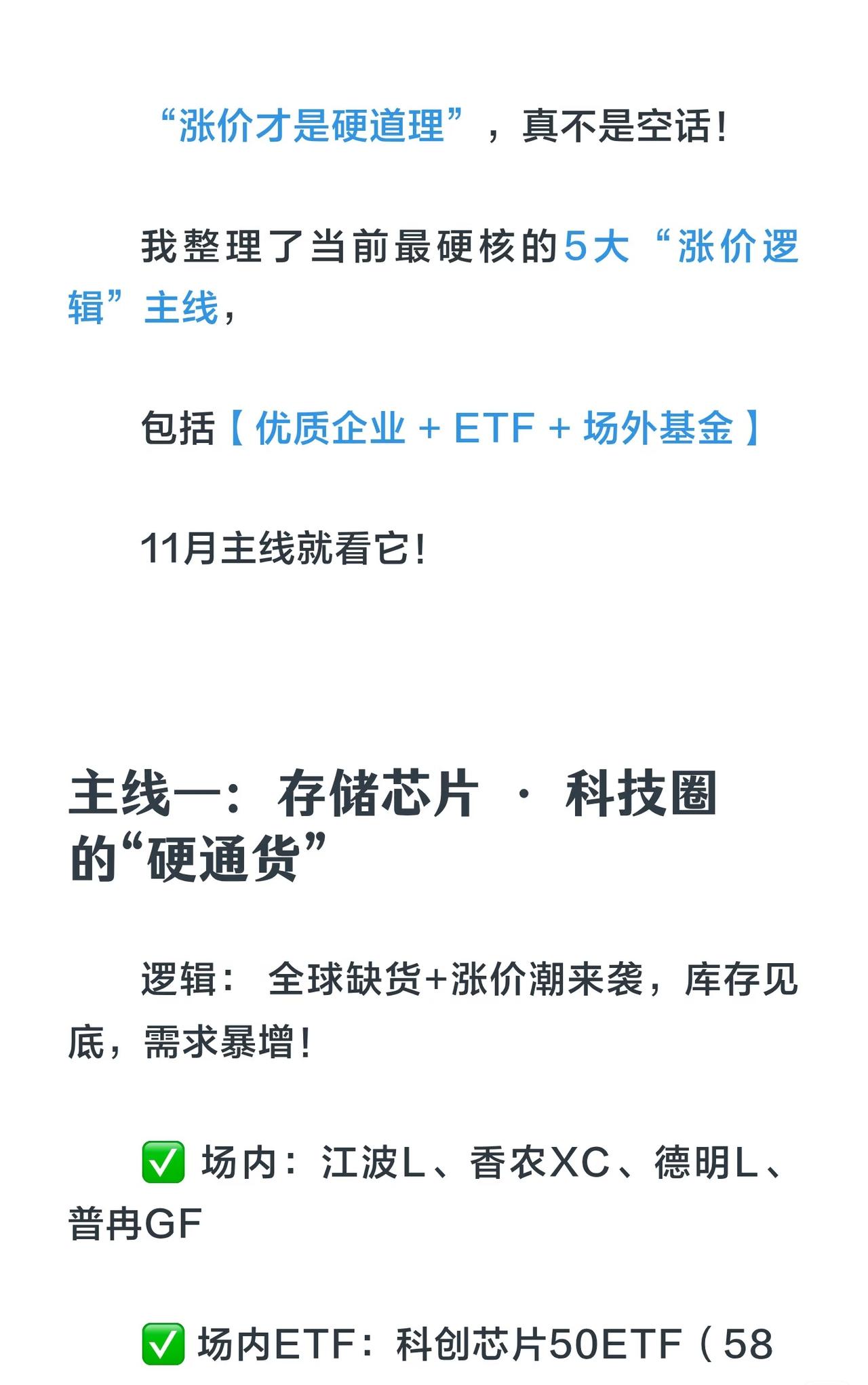 11月五大涨价主线核心总结 1. 存储芯片(科技硬通货) - 逻辑:全球缺货、库存见底、需求暴增。 - 标的: - 场内:江波龙、香农芯创、德明利、普冉股份 - 场内ETF:科创芯片50ETF(588200) - 场外:永赢先锋半导体智选混合C(025209) 2. 储能产业链(新能源压舱石) - 逻辑:反内卷+需求拉动,价格触底反弹。 - 细分: - 光伏:通威股份、隆基绿能、晶澳科技 + 光伏ETF(515790) + 汇丰晋信时代先锋混合C(014918) - 储能电池(六氟/添加剂/溶剂):宁德时代、阳光电源等 + 储能电池ETF(159566) + 南方中证电池主题指数C(018927) - 锂:赣锋锂业、天齐锂业等 3. 电网设备(电力投资排头兵) - 逻辑:国家电网投资加速,订单饱满。 - 标的:中能电气、摩恩电气、金盘科技等 + 电网设备ETF(159326) 4. 磷化工(双栖明星) - 逻辑:新能源电池+化肥刚需,资源价值重估。 - 标的:清水源、澄星股份、中毅达、云天化 + 化工50ETF(516120) 5. 有色金属(周期之王) - 逻辑:全球供给受限,新能源需求爆发。 - 标的:中国铝业、华友钴业等 + 有色50ETF(159652) + 中欧资源精选混合C(023037) 核心策略: - 涨价本质:供不应求 → 抓住它就能把握股价上涨关键。 - 建议:分散配置,避免单押;保持耐心,紧盯主线!