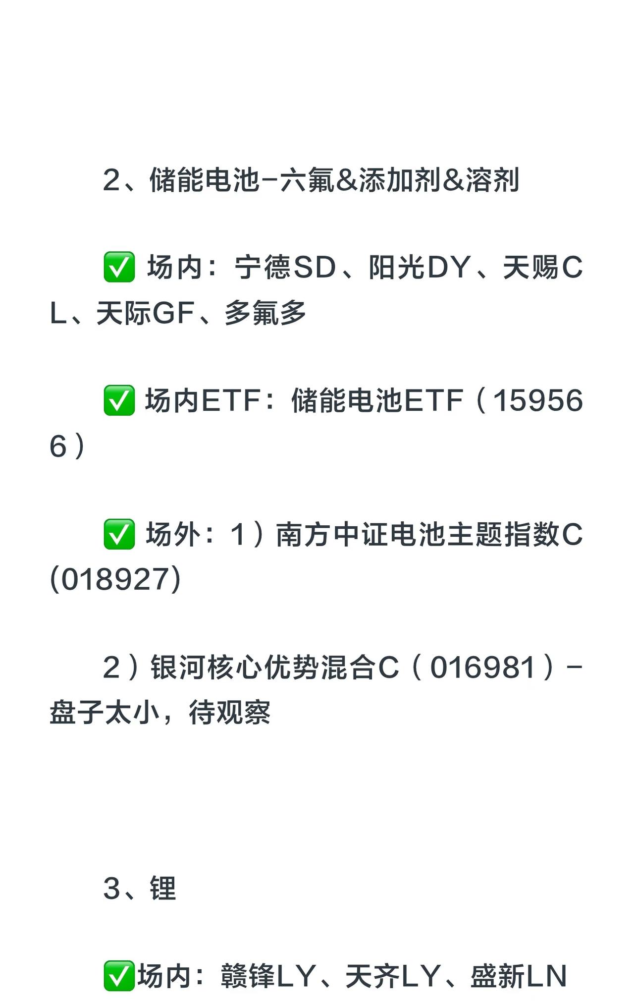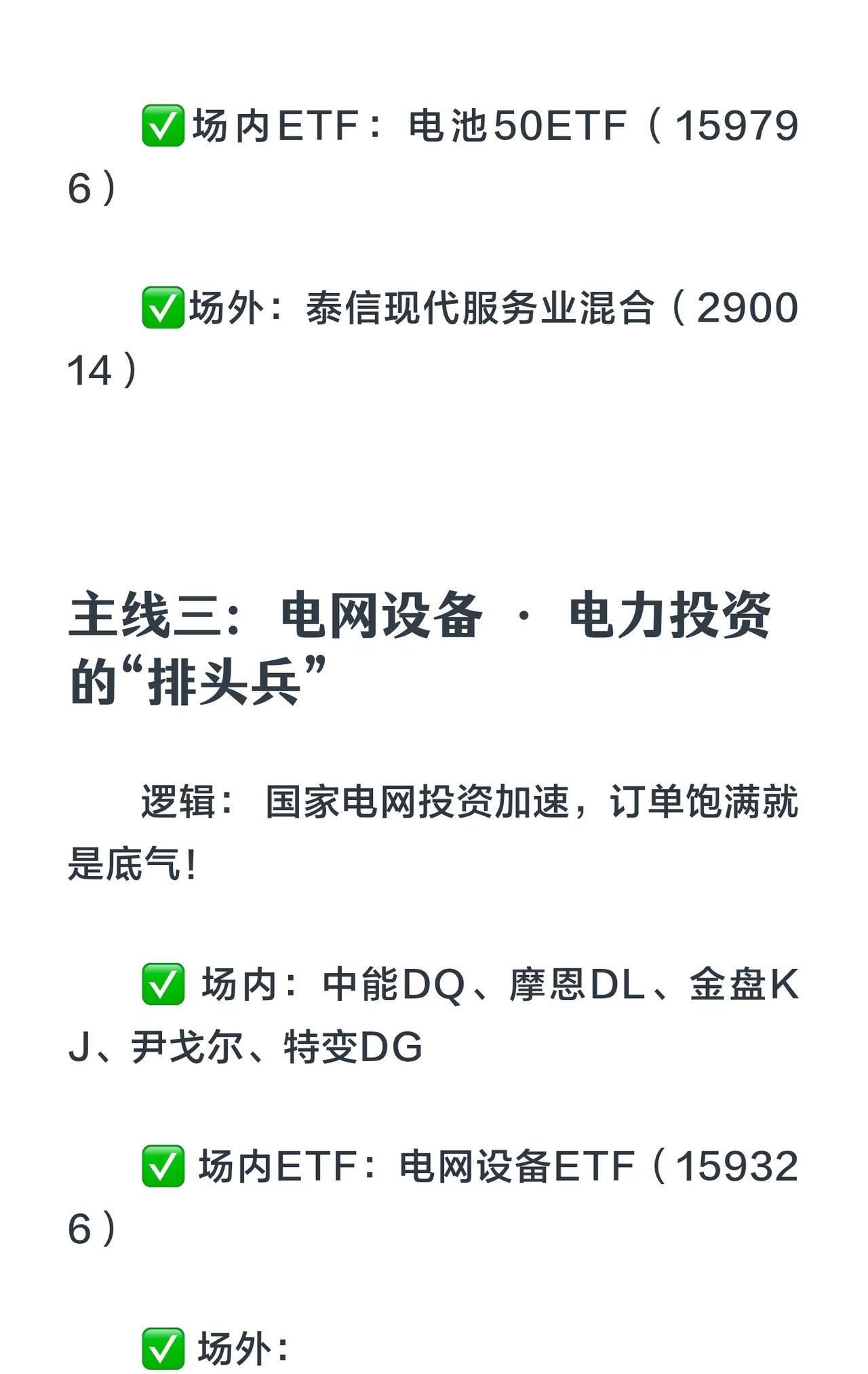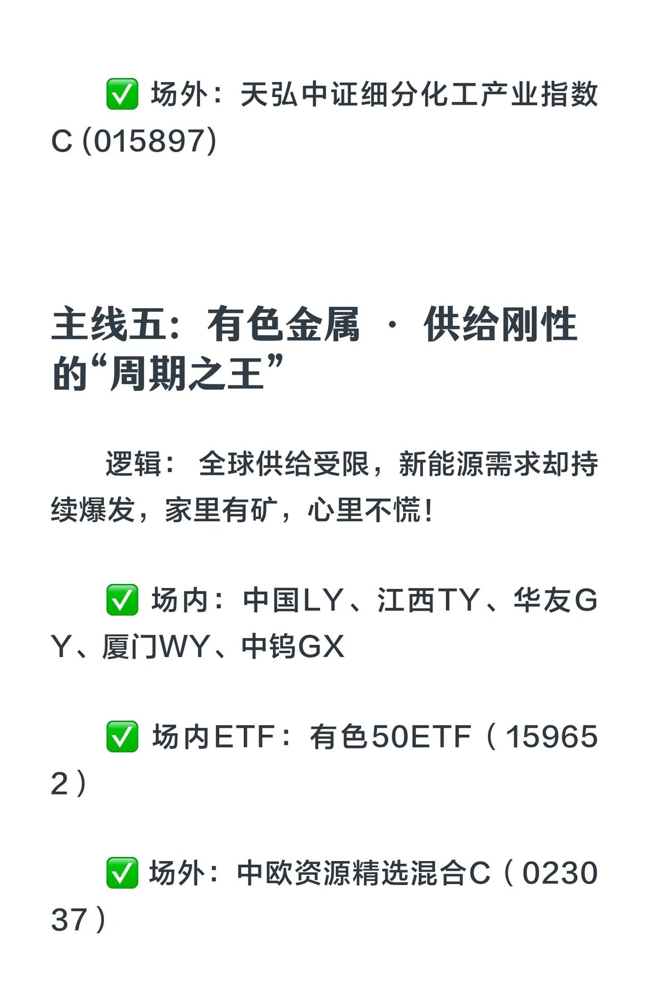 11月五大涨价主线核心总结 1. 存储芯片(科技硬通货) - 逻辑:全球缺货、库存见底、需求暴增。 - 标的: - 场内:江波龙、香农芯创、德明利、普冉股份 - 场内ETF:科创芯片50ETF(588200) - 场外:永赢先锋半导体智选混合C(025209) 2. 储能产业链(新能源压舱石) - 逻辑:反内卷+需求拉动,价格触底反弹。 - 细分: - 光伏:通威股份、隆基绿能、晶澳科技 + 光伏ETF(515790) + 汇丰晋信时代先锋混合C(014918) - 储能电池(六氟/添加剂/溶剂):宁德时代、阳光电源等 + 储能电池ETF(159566) + 南方中证电池主题指数C(018927) - 锂:赣锋锂业、天齐锂业等 3. 电网设备(电力投资排头兵) - 逻辑:国家电网投资加速,订单饱满。 - 标的:中能电气、摩恩电气、金盘科技等 + 电网设备ETF(159326) 4. 磷化工(双栖明星) - 逻辑:新能源电池+化肥刚需,资源价值重估。 - 标的:清水源、澄星股份、中毅达、云天化 + 化工50ETF(516120) 5. 有色金属(周期之王) - 逻辑:全球供给受限,新能源需求爆发。 - 标的:中国铝业、华友钴业等 + 有色50ETF(159652) + 中欧资源精选混合C(023037) 核心策略: - 涨价本质:供不应求 → 抓住它就能把握股价上涨关键。 - 建议:分散配置,避免单押;保持耐心,紧盯主线!