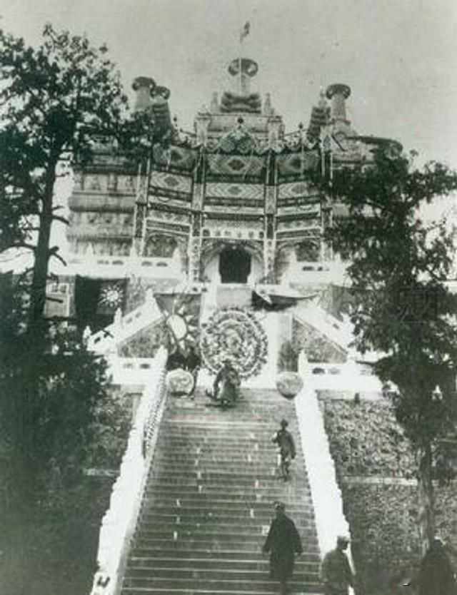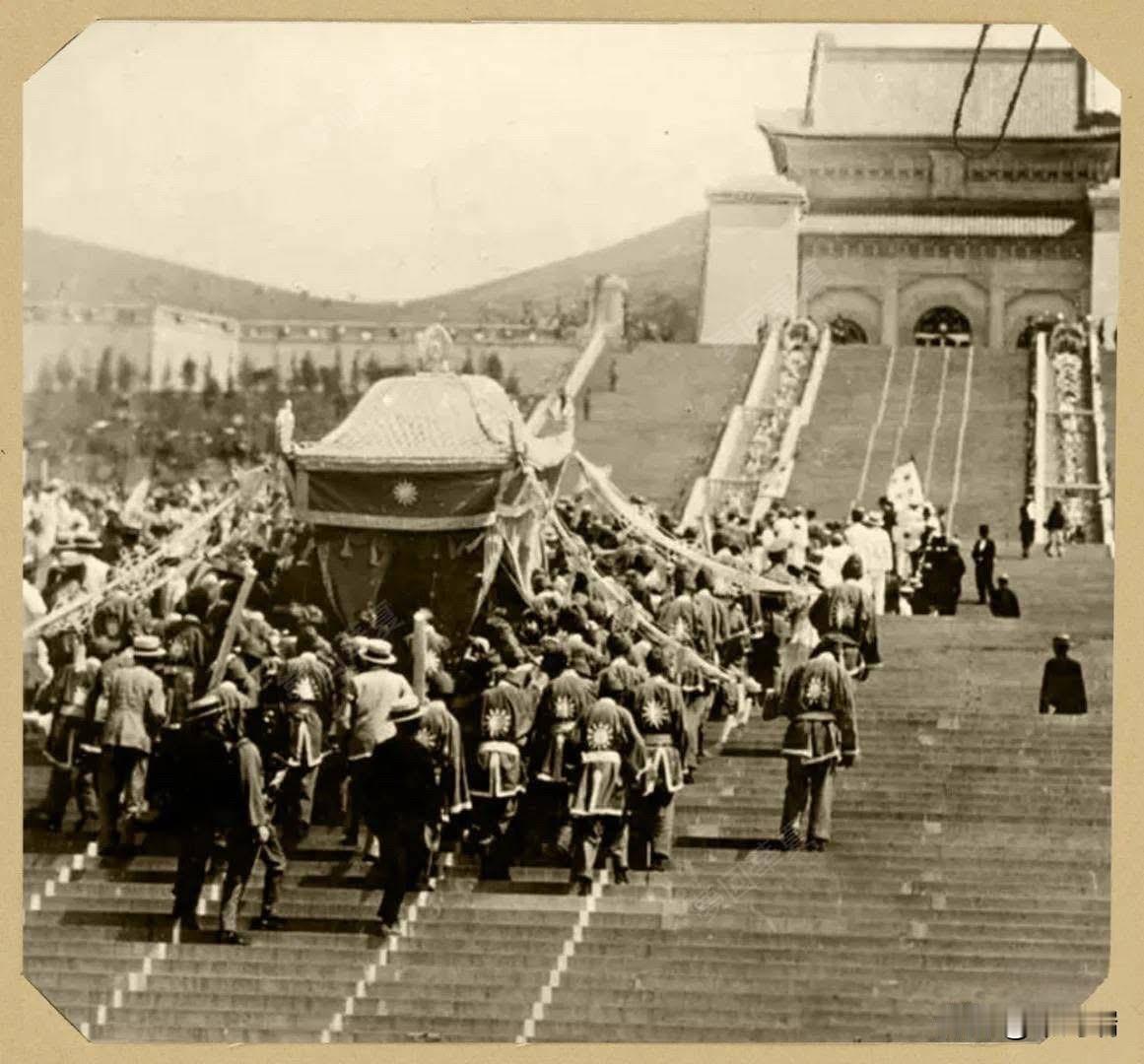 100年前,30万人为他送行 孙中山先生逝世后,他的遗体被送往北京协和医院进行防腐处理。1925年3月15日,孙中山先生的家属举行了追悼会,并将遗体装入玻璃棺中供吊唁者瞻仰。在北京灵堂内,挂有对联“革命尚未成功,同志仍需努力”,并贴有孙中山遗嘱全文。 孙中山先生生前有遗愿希望被安葬在紫金山。最初,他的灵柩被暂时移至北京碧云寺停放。直到1926年1月,中山陵才开始动工修建。1929年5月(三年后)竣工后,成立了专门的葬礼委员会,负责将孙中山先生移灵至中山陵。移灵过程中,国民政府规定全国停止一切娱乐活动,所有单位及使领馆降半旗致哀。5月26日,孙中山灵柩从碧云寺移出,沿途有30万人送殡,送葬队伍长达三公里。5月31日,灵柩抵达南京后,由蒋介石主持举行了封棺仪式。 拍摄时间:1929年 拍摄地点:南京