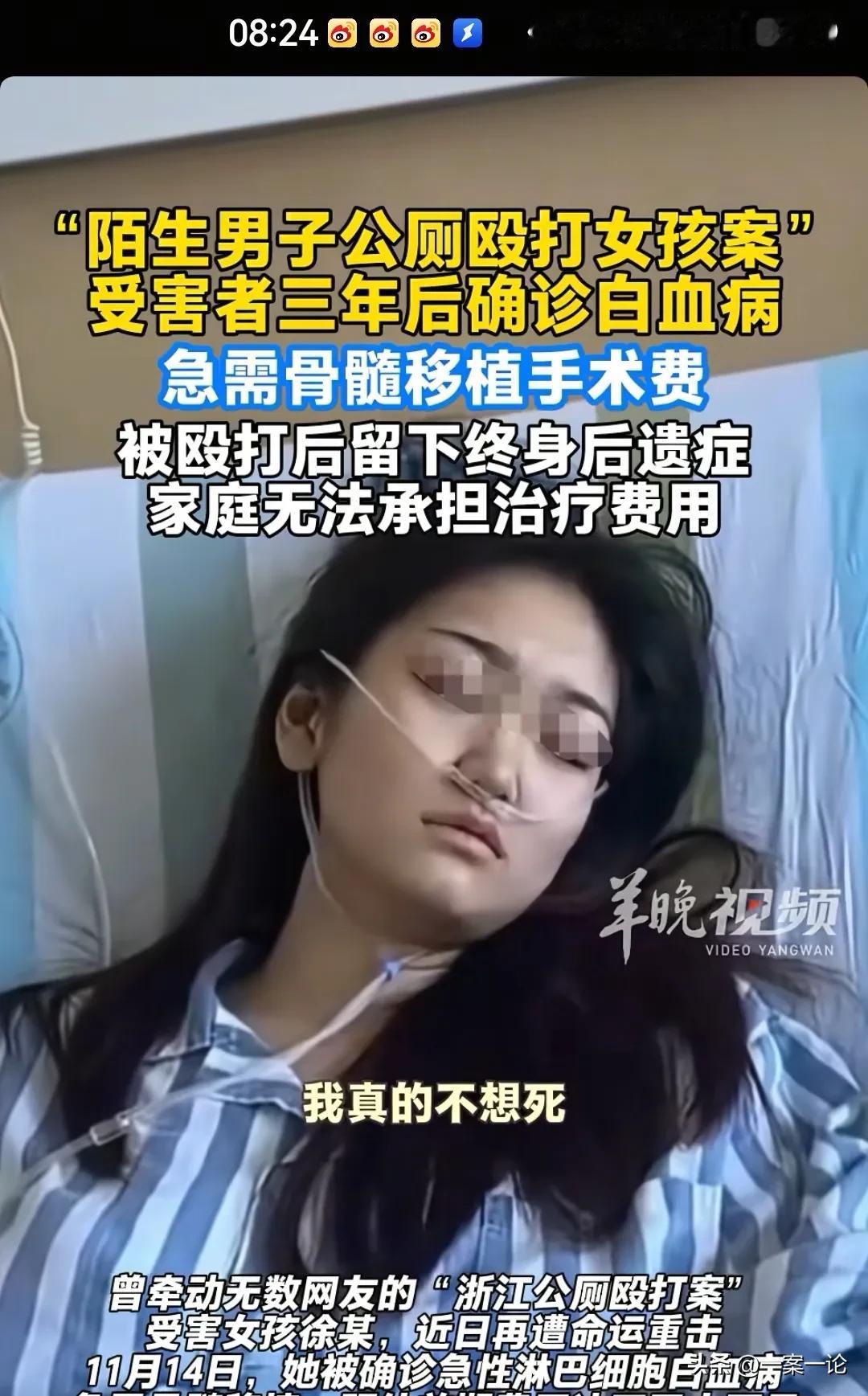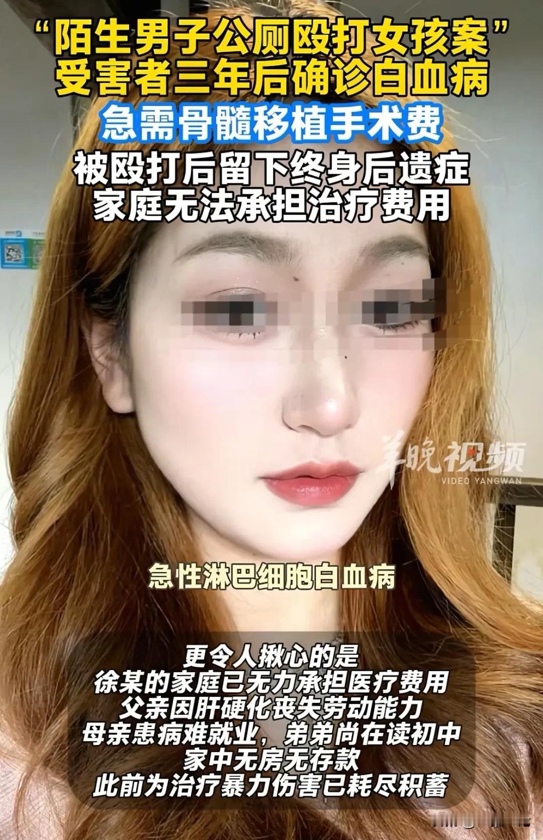 浙江永康,女子走进一个公厕,尾随着一个陌生男子,女子发现了想赶紧出去,结果被男子殴打了20多分钟,导致头部,眼部,舌头多处受伤,为了疗伤,他们家花光了积蓄,如今,不幸又袭来,她患上了白血病。 徐女士躺在床上,承受着病痛的折磨,她内心十分痛苦,多么希望有好心人,能够给她捐款,让她多活一天也好。 她的思绪如汹涌的大海翻滚着,家中已经一贫如洗,父亲患了重病没有劳动力,母亲也同样有病不能工作,家中还有一个读初中的弟弟,现在她又患了病,家中已经没有任何能力为她治病了。 她非常痛苦,她还年轻,她还想活着,她才20来岁,人生才刚刚开始,现在她又得了重病,如果不是2022年发生的那一件事,或许她家中还有钱为她争得一线生机。 痛苦的她,思绪又回到了2022年的那一件事上,那件事已经深入了她的骨髓,让她刻骨铭心。 事情发生的那一天,她肚子不舒服,就想着赶紧找个厕所,她匆匆忙忙走进了一个公厕。 不料却有一个陌生男子尾随她,她也不知道这个男子为何要尾随她,那一天她的穿着很正常,也比较保守,不存在衣着过于暴露而吸引了这个陌生男子。 她是后来才知道,这个陌生男子,在她开的店转了几天,可能是早就盯上她了。 但女子还是不认识这个男子,她发现男子跟她进入公测之后,她看着公厕空无一人,她的第一反应就想着赶紧逃跑,但是这个陌生男子迎面而上,上来就殴打她。 可怜的徐女士,她手无缚鸡之力,哪里能对抗如此一个壮汉。 这个男子上来就使劲地殴打她,她就这样被殴打着,一打就被打了二十多分钟。 这20多分钟,漫长得犹如一生,让她感觉受尽了一生的疼痛。 事实正是如此,这20多分钟的殴打,给她造成了轻伤二级。 而这件事带给她的伤害,还远远不止这些,当时她被殴打得浑身受伤。 为了治这些伤,家里人掏出了全部的积蓄,都无法让她摆脱这件事带给她的阴影。 如果不是因为这件事,他们家还有积蓄,这些积蓄也可以救她一命。 如今就因为这件事,徐女士根本没有钱治病了。 可怜的徐女士,上有两个已经因为生病无法工作的父母,下有一个读初中的弟弟,如今她也得了白血病。 这个病如果没有钱治疗,将会剥夺她的人生。 可怜的徐女士,她还没有走出2022年的那件事情,如今又受到病魔的折磨,她真的太痛苦了。 从情感上面来说,许女士只是一个普通的女子,她才20出头,人生确实刚刚开始,她就经历了被陌生男子殴打20多分钟的事,这本来就是影响她一生的事情,如今年纪轻轻又得了白血病,这真的会让她感到恐惧。 这个时候的她,是真的希望有人能够伸出援助之手,救她于水火之中。 从理这方面来说,徐女士根本不认识这个陌生男子,陌生男子居然殴打她20多分钟,陌生男子的行为是真的很恶劣的。 从法律上来说,陌生男子殴打徐女士这件事情,已经造成了轻伤二级,那么陌生男子的行为已经构成了故意伤害罪。 《刑法》第234条规定:故意伤害他人身体的,处三年以下有期徒刑、拘役或者管制;致人重伤的,处三年以上十年以下有期徒刑;致人死亡或者以特别残忍手段致人重伤造成严重残疾的,处十年以上有期徒刑、无期徒刑或者死刑。 2022年发生的事情,陌生男子也已经受到法律的制裁了。 但徐女士因为这件事情一直处于阴影中,她其实还可以要求精神赔偿。 《民法典》第1183条规定:明确侵害自然人人身权益造成严重精神损害的,被侵权人有权请求精神损害赔偿;因故意或重大过失侵害具有人身意义的特定物造成严重精神损害的, 如果没有因为这件事情,或许女子家还有积蓄,还有治疗白血病的钱。 如今徐女士只能等待别人的捐款了,她真的是很可怜。 那么你对徐女士的遭遇有何看法呢?