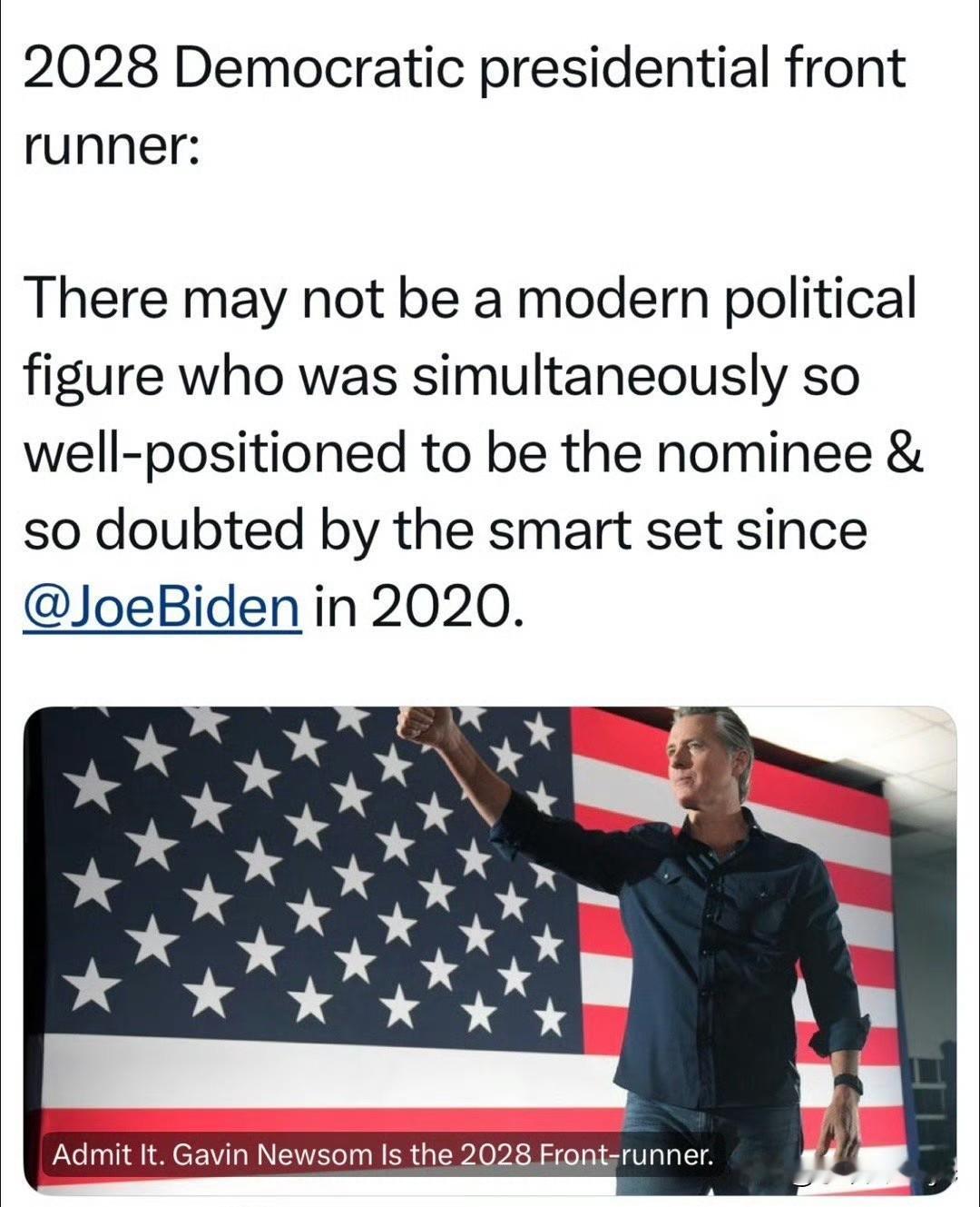 美国时政媒体:没人这么明显地具有优势、同时又如此被怀疑和否定…但是承认吧,Newsom(纽森)现在就是2028总统大选最有力的竞争者 。 加文·纽森(Gavin Newsom)目前确实被美国多家时政媒体视为2028年美国总统大选的有力竞争者,他通过一系列积极的政治运作,已经为自己建立了早期优势。 在潜在竞争对手尚未全面行动时,他已通过中期选举后的高频次活动,在媒体和捐款人中积极铺垫,抢占了先机。成功推动并赢得了加州重新划分选区的50号提案,此举被广泛视为其政治实力的一次重要展示。 美国的总统竞选是一场马拉松,真正的党内竞争还没开始。随着竞选进程深入,他将面临更严格的审视,关于其加州政策(如为无合法身份的移民提供免费医疗)的争议,很可能成为对手攻击的焦点。最终,民主党选民在初选中很可能将回归一个核心考量:哪位候选人被认为在全国大选中最具“可当选性”。 总而言之,纽森无疑是当前最引人注目的领跑者,但他的前方并非坦途。未来的选情将在与其他民主党重磅候选人的接较量中逐渐明朗。能不能成为民主党的总统候选人还存在变数。