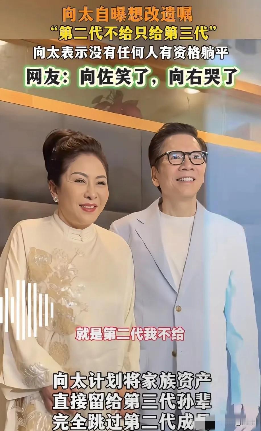 王晶说:豪门都非常会算计,越有钱越算计,你想从豪门身上,得到什么好处比登天还难…… 果然嫁入豪门深似海! 向太自爆想修改遗嘱!不知道,郭小姐知道婆婆要改遗嘱有何感想? 向太说在商量要不要改遗嘱: 遗产给三代不给二代!言外之意就是二代必须自己努力,想要遗产就多生几个孩子。不知道她这波操作,会不会刺激到小儿子向佑,毕竟他还未婚未育。 果然姜还是老的辣!这一招既能打消儿子躺平念头,又能催婚催生,一举两得啊!