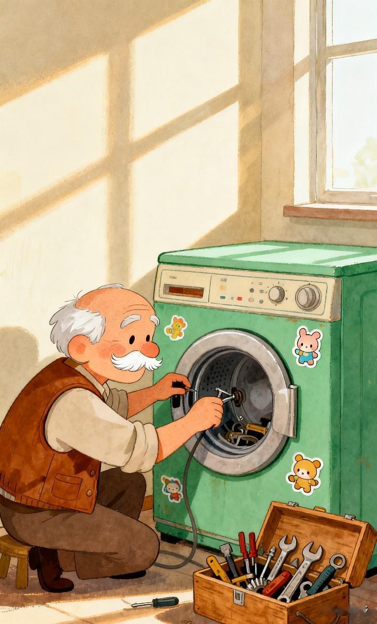 老李头家那台服役十年的洗衣机,最近闹起了脾气——工作时“哐当哐当”响,动静大得吓人,衣服却怎么也甩不干。 女儿在电话里劝他:“爸,别修了,直接换台新的!现在都是智能的,还能手机控制呢。”老李头嘴上嗯嗯应着,心里却放不下:这老伙计,洗过儿子的尿布,涮过老伴的棉袄,哪能说扔就扔? 他戴上老花镜,自己先琢磨。断电、放水、侧过机身,拧开底座几个螺丝一看,心里顿时亮堂了——原来是底部的传动皮带老化,断了一截,剩下的也磨得满是裂纹。 “毛病不大,芯子没坏。”他嘀咕着,揣上断皮带就去了五金店。花了二十块钱买了根新皮带,回来照着原样装上。拧动开关,洗衣机“嗡”一声轻吟,转得又稳又安静。 晚上他特意给女儿打去视频,镜头对准修好的洗衣机:“闺女你看,爸这手艺还行吧?花了二十,又能再战几年!” 女儿在屏幕那头笑:“您可真会过日子。” 老李头也笑了,轻轻拍了拍洗衣机面板,像拍着老伙计的肩膀: “不是爸舍不得,是它还好好的,就能一直用下去。东西如此,人也是一样,我们这辈人啊,图的就是个‘有用’。” 洗衣机沉稳地转动着,仿佛在默默应和。洗衣机 洗衣机洗过什么 洗衣机坏掉 家用老式洗衣机 老人故事