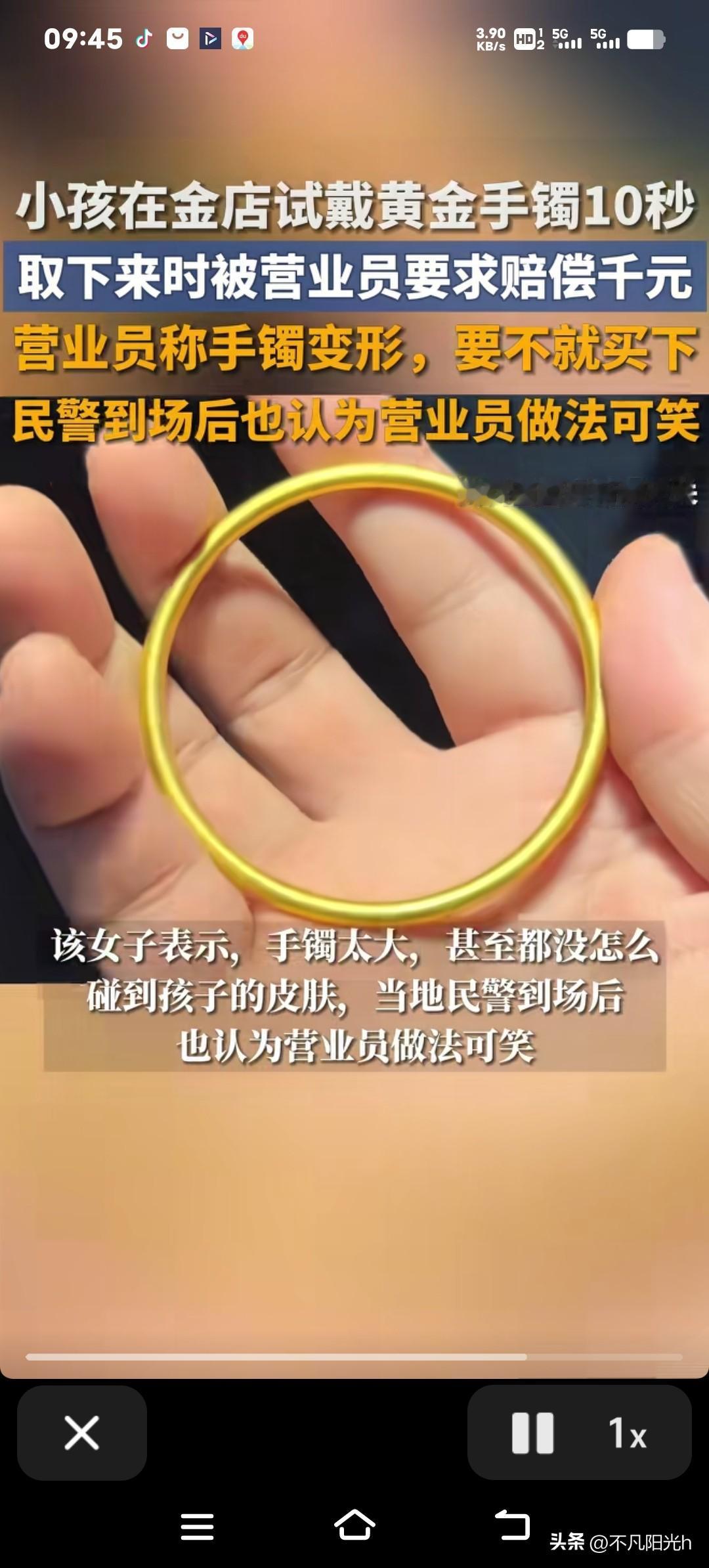 10秒试戴金镯子就得赔1000块?民警看了都觉得离谱!现在逛金店是不是得先签个免责协议啊? 最近熊猫黄金门店可真是出了个新鲜事。有位宝妈带着孩子去试戴金镯子,整个试戴过程加起来都不到10秒钟,店员却突然过来说这金镯子变形了,得赔1000块钱。当时现场拍的视频能看到,那金镯子晃悠起来能在孩子手腕上转好几个圈,民警到了现场,都忍不住说这事儿太离谱:“试戴前要是不想让人试,早说不就行了!” 这事儿在网上可把网友们吵翻了天。有网友开玩笑说现在金店都玩起了“碰瓷式销售”,试戴之前还得先交押金;还有不少人都在问:黄金首饰到底能有多娇贵啊?有懂行的人说,足金的质地本来就比较软,但正常试戴的话,是不会变形的,除非是故意去使劲掰弄它。 熊猫黄金店的客服回应说会去核实情况,还特意强调店员都是经过培训的。不过网友们可不买这个账:“那培训到底是教了什么,是教着怎么坑顾客钱吗?”现在当地的市场监管部门已经介入调查了,他们也建议消费者如果遇到这种类似的纠纷,直接报警处理。 试戴本来就是买东西时很正常的环节,可现在怎么就变成消费陷阱了呢?大家觉得这事儿到底是该怪店员个人的做法,还是品牌管理上的问题呢?你有没有遇到过试戴金饰被刁难的情况?评论区等你分享!