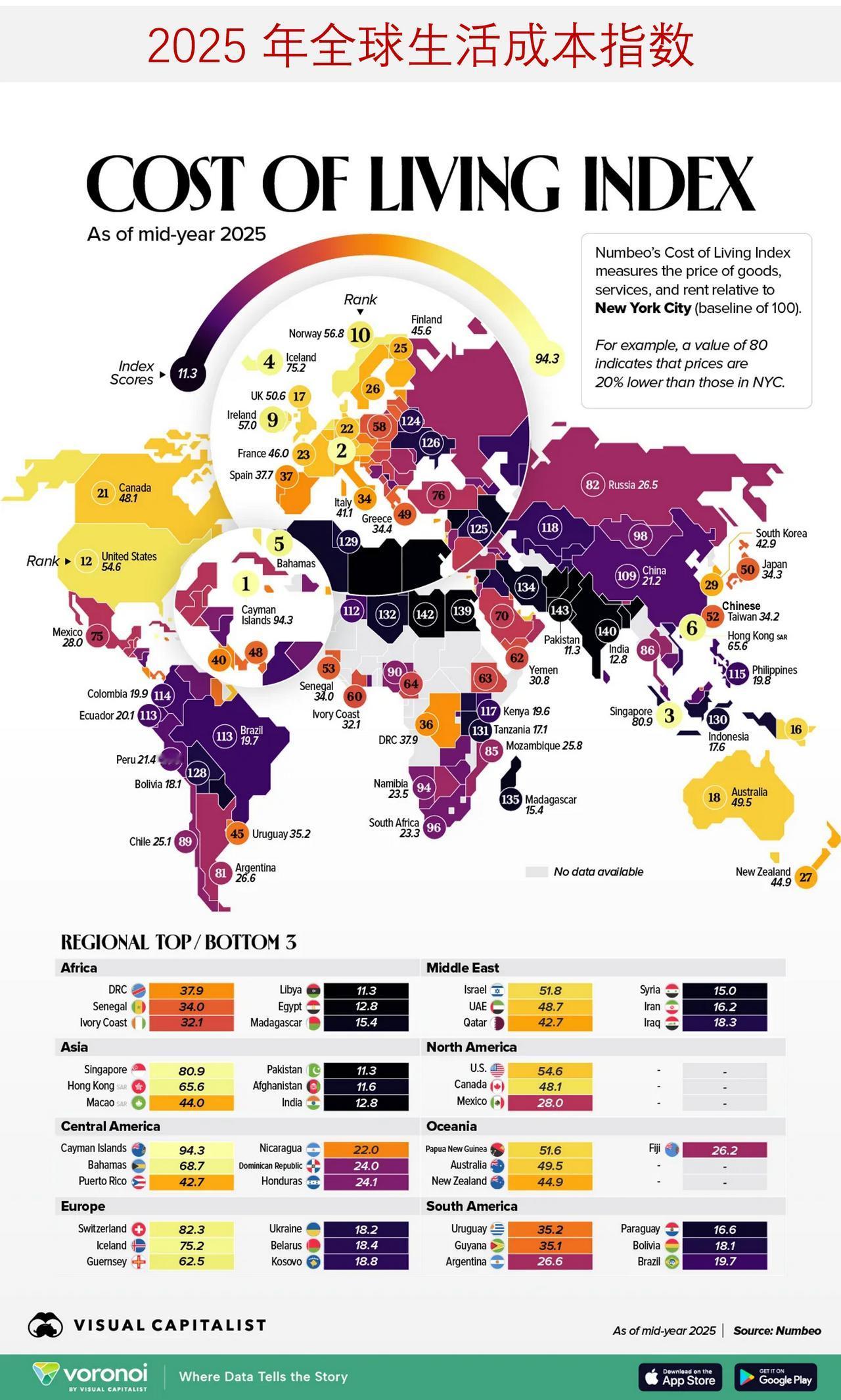 世界各地的生活成本有何差异?来看2025 年全球生活成本指数地图 为了弄清楚情况,这里对 Numbeo 的生活成本指数结果进行了可视化处理。该指数衡量了商品、服务和房租的价格与纽约市的相对比例(以 纽约市100 作为基准值)。 例如,如果一个国家的数值为 80,这意味着其物价比纽约市的物价低 20%。 此图表所使用的数据来自 Numbeo,这是全球最大的由公众提供的价格及生活成本数据库。该信息图中所展示的数值将日常开销与住房费用相结合,从而提供了对经济负担的整体衡量标准。 ——世界上生活成本最高的地方 在排名榜首的是开曼群岛(94.3 分)。它的经济主要由离岸金融、旅游业和房地产业支撑——这些行业吸引了众多富裕居民和投资者。 瑞士(82.3 分)和新加坡(80.9 分)紧随其后,这反映了它们发达的经济、较高的工资水平以及优质的房地产市场。 欧洲国家也位列前二十名之列,其中冰岛、爱尔兰和挪威均在最昂贵的国家之列。这些国家通常能提供较高的生活水平,但也面临着高昂消费价格的矛盾问题。 ——世界上最经济实惠的地方 在另一端,巴基斯坦(11.3 分)、利比亚(11.3 分)和阿富汗(11.6 分)的居民生活成本得分在全球范围内处于最低水平。 南亚大部分地区,包括印度(12.8)和孟加拉国(13.0),其物价也大约是纽约市的八分之一。这两个国家都有庞大的年轻人口和相对较低的工资水平,这使得劳动力和服务的成本得以降低。