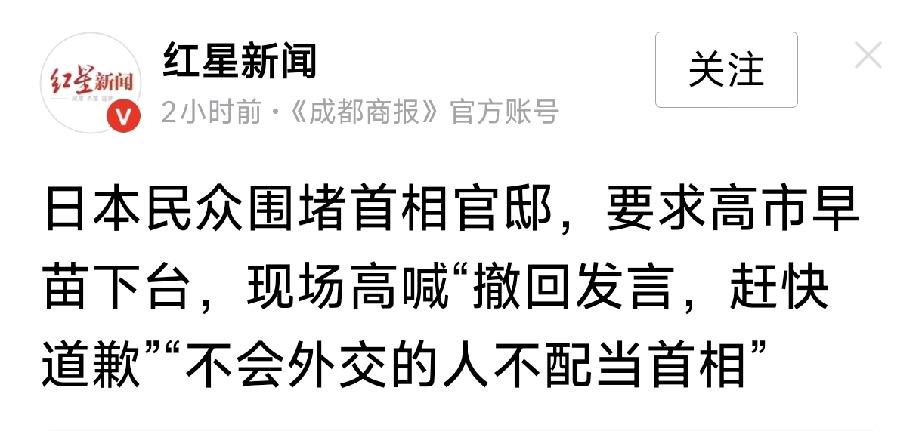 日本民众围堵首相官邸,要求高市早苗下台,现场高喊“撤回发言,赶快道歉”“不会外交的人不配当首相”!当地时间11月15日,上百名日本民众自发围堵首相官邸,要求高市早苗下台。现场“撤回发言,赶快道歉”等口号此起彼伏。原来是高市早苗在多个场合发表涉华错误言行,公然鼓吹武力介入台海,严重违背一个中国原则和国际关系准则。 这种行为不仅引发中方强烈不满与抗议,在日本国内也遭多方批评。公明党党首齐藤铁夫、前首相石破茂等都发声质疑。高市早苗如此行径,既破坏外交关系,又不得民心,下台或许才是正确选择。