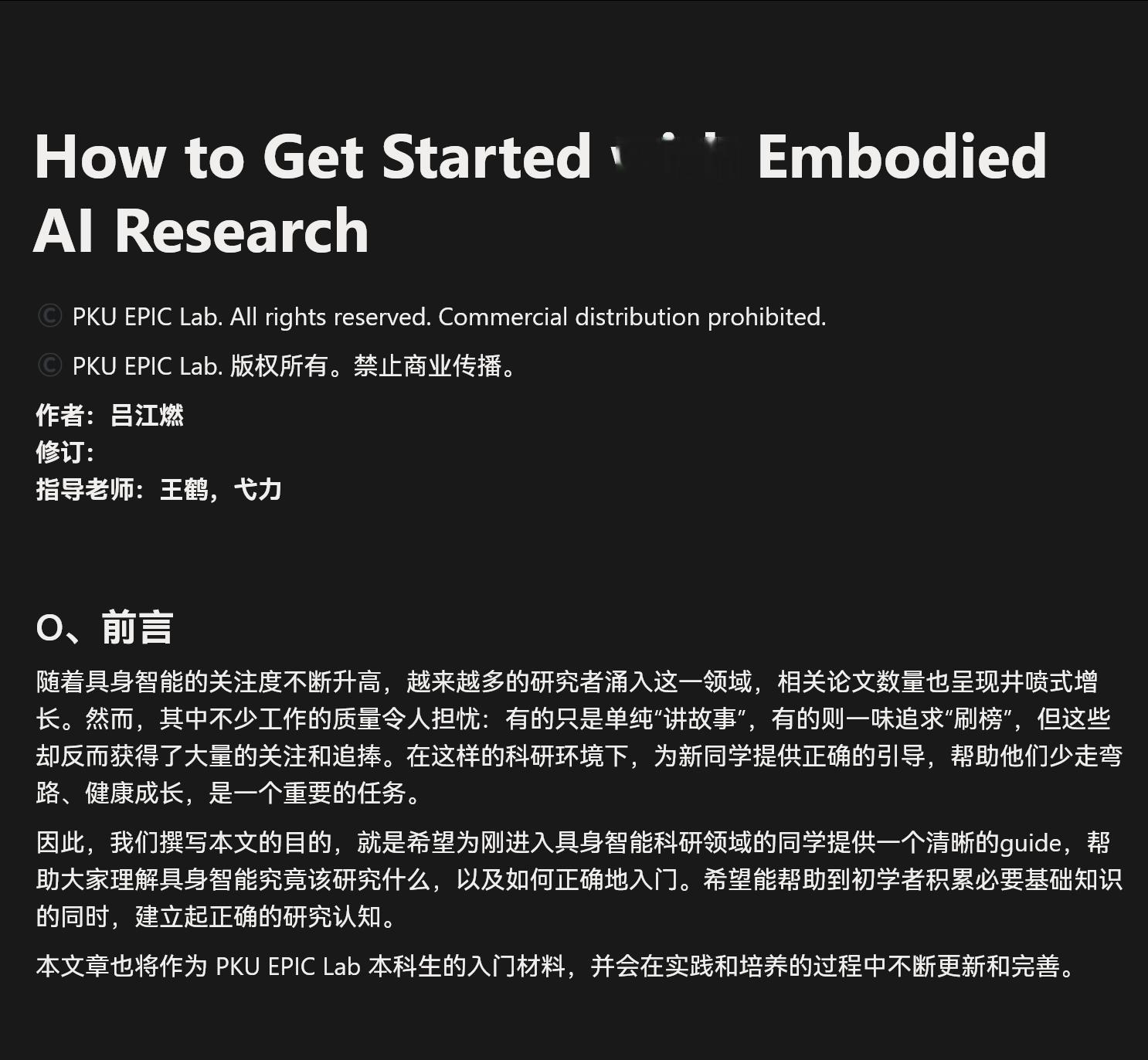 面向小白的具身智能入门指南 -- 北大具身感知与交互实验室出品github.com/jiangranlv/embodied-ai-start“随着具身智能的关注度不断升高,越来越多的研究者涌入这一领域,相关论文数量也呈现井喷式增长。然而,其中不少工作的质量令人担忧:有的只是单纯“讲故事”,有的则一味追求“刷榜”,但这些却反而获得了大量的关注和追捧。在这样的科研环境下,为新同学提供正确的引导,帮助他们少走弯路、健康成长,是一个重要的任务。因此,我们撰写本文的目的,就是希望为刚进入具身智能科研领域的同学提供一个清晰的guide,帮助大家理解具身智能究竟该研究什么,以及如何正确地入门。希望能帮助到初学者积累必要基础知识的同时,建立起正确的研究认知。本文章也将作为 PKU EPIC Lab 本科生的入门材料,并会在实践和培养的过程中不断更新和完善。”