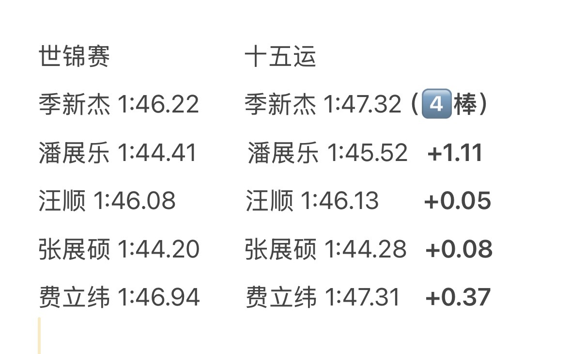 赛前按计算器就知道你浙不每个人发挥出今年的最好的水平就赢不了。回看昨天4X200自接在场的gjd主力的发挥,只有汪顺跟zzs的分段跟新加坡4X200自决赛的发挥基本持平(这场🇨🇳破了AR)甚至汪顺与自己的pb差距更是微乎其微。在不熟悉的棒次,连续几天那么大消耗下谁看了不说一句汪顺nb然而谁差得最多呢,真的好明显