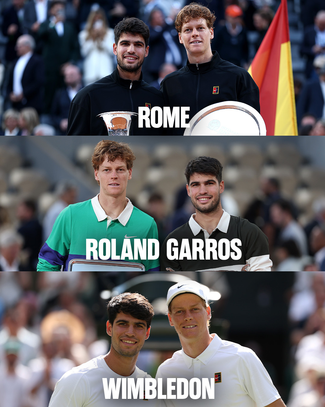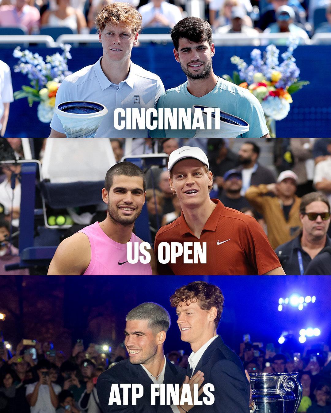 罗马决赛:阿尔卡拉斯7-6(5)/6-1辛纳法网决赛:阿尔卡拉斯4-6/6-7(4)/6-4/7-6(3)/7-6(10-2)辛纳温网决赛:辛纳4-6/6-4/6-4/6-4阿尔卡拉斯辛辛那提决赛:阿尔卡拉斯5-0辛纳(退赛)美网决赛:阿尔卡拉斯6-2/3-6/6-1/6-4辛纳总决赛争冠战:阿尔卡拉斯vs辛纳❓🔥2025赛季的第六次辛卡大战,周一凌晨一点不见不散!总交手记录10胜5负保持领先的阿尔卡拉斯,能在辛纳最强的室内硬地场终结他的连胜吗?你更看好谁能笑傲都灵总决赛呢?