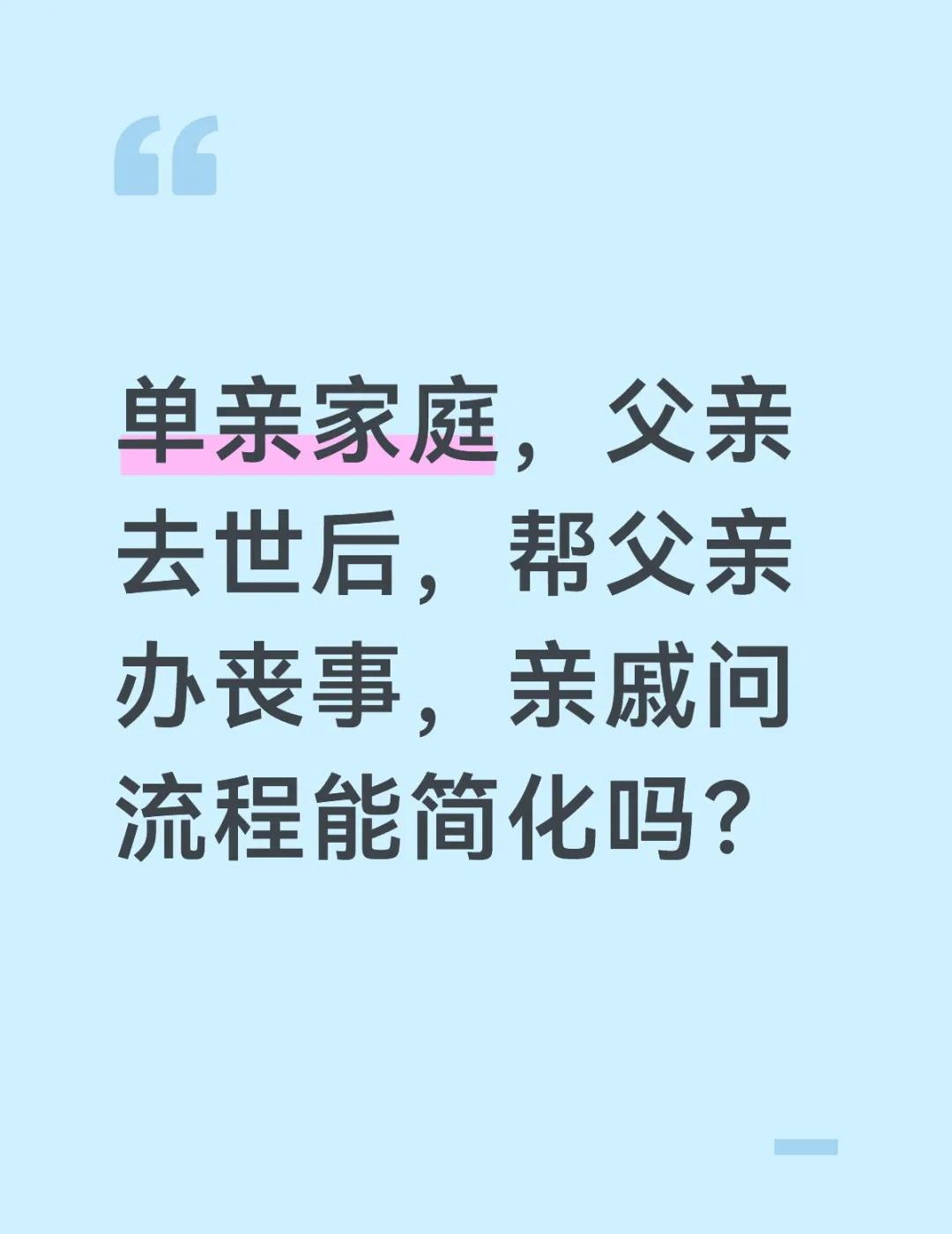 单亲家庭,父亲去世后,帮父亲办丧事 父亲有一个姐姐,一个哥哥,一个弟弟,都生了一个小孩。父亲出殡需要自家人帮忙捧照片和拿雨伞,我和我老公一个拿骨灰一个拿香炉,我女儿十个月没到帮不了忙。现在缺两个人,本来想着和我同辈的哥哥姐姐妹妹可以帮忙。叔叔和伯伯拒绝了,叔叔说妹妹外地工作不一定回得来,能不能把缺的那两个人的事情免了。伯伯说哥哥身体不好(另一个亲戚说哥哥是肝腹水),到时候应该能来但是帮不了忙,姑姑说女的做这些不太好(姑姑对我父亲一直挺好的)。我父亲生前对他们的儿女一直很好,对他们也好,现在就想她们出个人帮忙有这么难吗?朋友劝我看开点,他们提出愿意帮我爸撑雨伞和拿照片。虽然说不能道德绑架他们,但是真的心寒。 补充一下:我说请白事一条龙的人来帮忙,亲戚不同意,电话打来说觉得没面子,怕被别人说闲话,不愿意让我请人。就要我把那两个人该干的事情免了。一开始是他们要我弄的,现在又要我简化,没几天就要出殡了。 [流泪]
