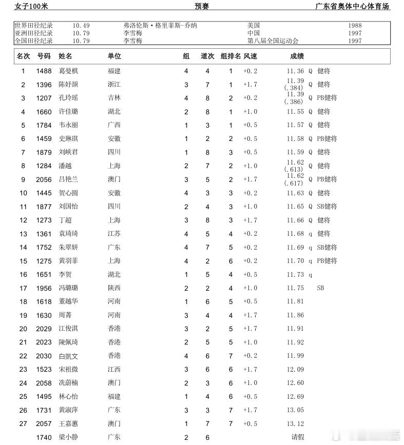 全运女子百米预赛葛曼棋强势第一陈妤颉次席 争冠大热梁小静遗憾伤退11月16日上午,全运田径大项结束了女子100米预赛争夺,福建选手葛曼棋以11秒36排名第一,浙江选手陈妤颉和吉林选手孔玲瑶同时跑出11秒39,计算千分秒,陈妤颉11秒384排名第二,孔玲瑶11秒386排名第三。因为在昨天的男女4X100米接力决赛里摔倒受伤,争冠大热梁小静无奈缺席女子100米预赛。按照赛事规则,每小组前三晋级,余下选手里选择最快四将合并晋级。葛曼棋在第四组亮相,0.147秒的出发反应时不错,葛曼棋起步阶段就处在领先,随后一路顺风顺水,领先到终点。比赛风速每秒0.2米小顺风。这组吉林队孔玲瑶状态神勇,第八道出发的她,能死死跟住葛曼棋,孔玲瑶跑出了11秒39的个人最佳,成为中国女子百米第41位突破11秒40大关的选手。陈妤颉第三组出场。陈妤颉在这组里实力超群,全程毫无悬念,冲刺时放慢脚步,但也跑出了11秒39。女子百米半决赛和决赛都将在明晚进行,半决赛19点00分开战,决赛21点10分开始。