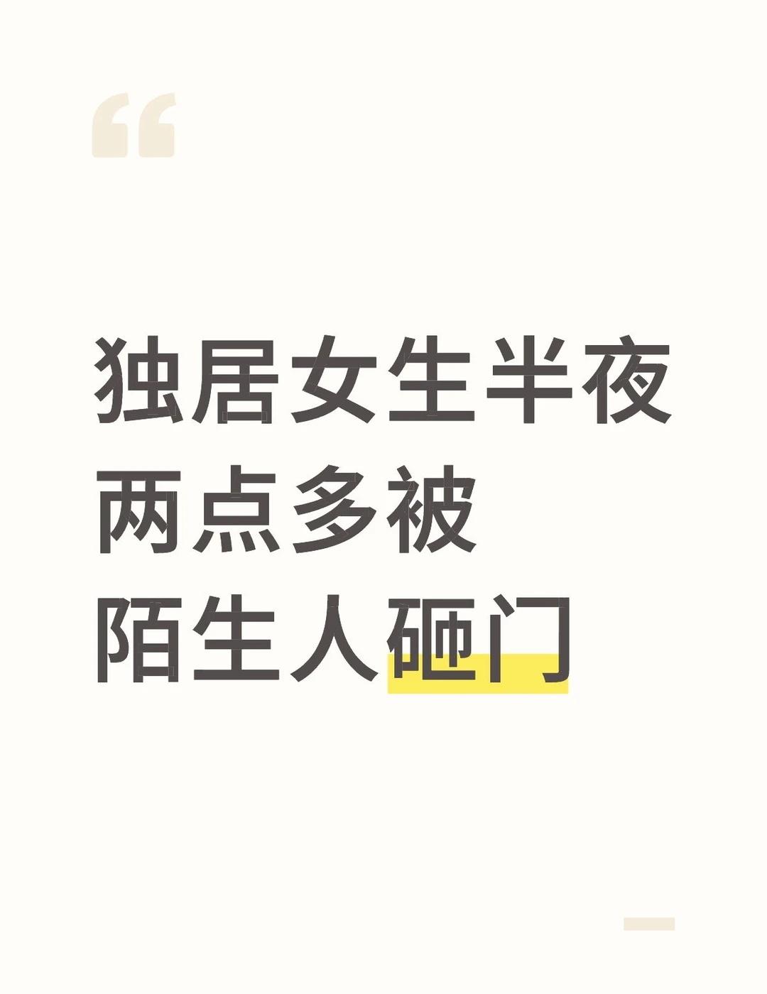 希望今晚还能睡得着 独居女生半夜两点多被陌生人砸门 被砸门声吓醒了,大声质问是谁,对方也不说只是一直叫开门 一个女的的声音 喊物业人员上来已经不见人了 想报警查监控把她找出来给我道歉! 第一反应是害怕,第二反应是气愤,想拿菜刀冲出去 女生要好好保护自己 保护自己