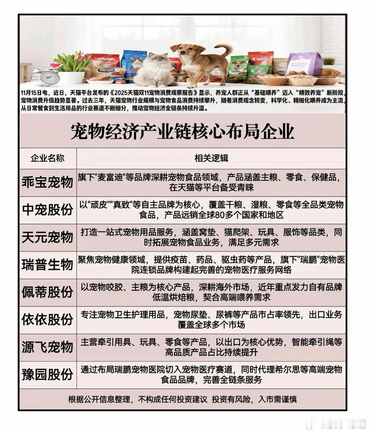 宠物经济产业链核心布局企业!11月15日电,近日,天猫平台发布的《2025天猫双11宠物消费观察报告》显示,养宠人群正从“基础喂养”迈入“精致养宠”新阶段宠物消费升级趋势显著。过去三年,天猫宠物行业规模与宠物食品消费持续攀升,随着消费观念转变,科学化、精细化喂养成为主流从日常餐食到生活用品的行业赛道不断细分,推动宠物经济全链条持续升温。