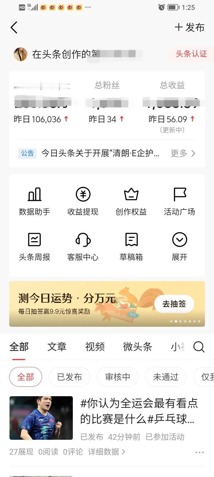 我的阅读量就是读者对我的最大认可,虽然收益没法和别人比,但也在回归正常。之前19万阅读量40几元,11万阅读量20几元,今天10万阅读量居然有50几元了,很开心现平台给我的鼓励。为了这些越来越多喜欢我作品的读者,我将持续创作下去,哪怕能给大家带来一丝愉悦之情,我也是深感荣幸[作揖]