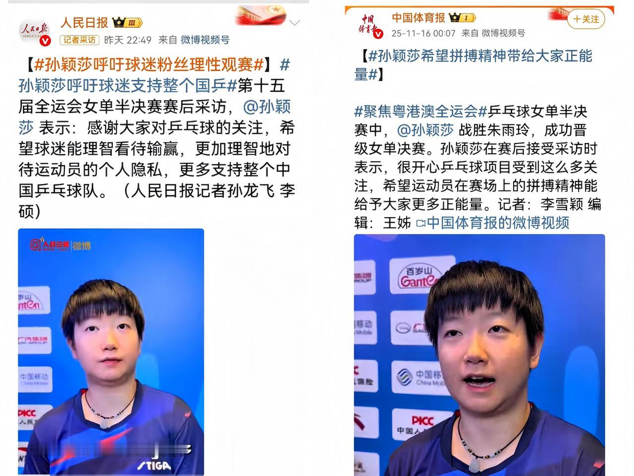 莎莎赛后采访发言: 感谢大家对乒乓球的关注与喜爱, 也真诚呼吁大家理性看待比赛输赢。 她希望赛场上每一份拼搏的精神, 都能化作激励我们生活的正能量。 让我们一起响应莎莎的呼吁, 让热爱回归赛场本身, 用支持和理解陪伴运动员成长。