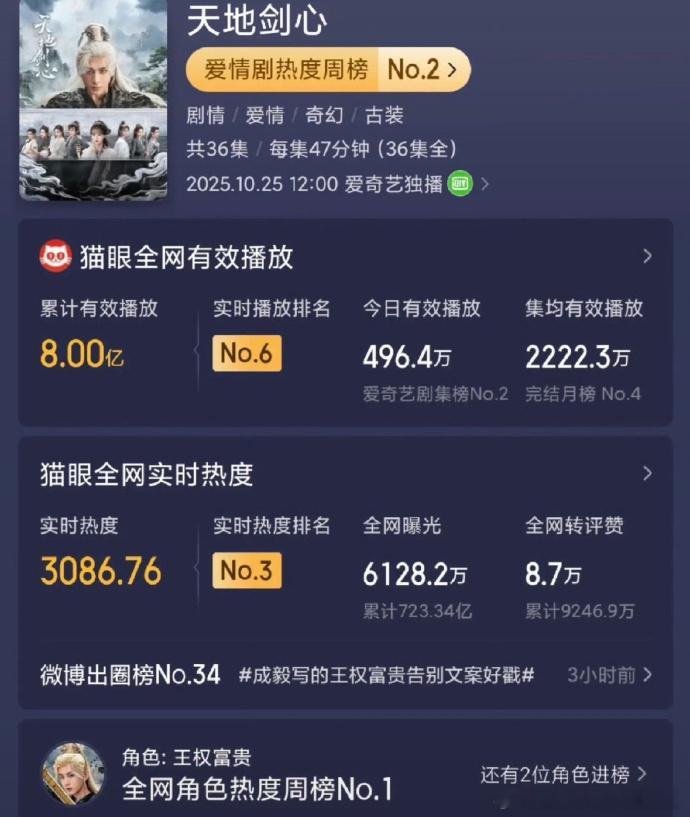 成毅凭王权富贵引爆热度,《天地剑心》角色数据破 10 亿,登顶爱奇艺总榜史冠。