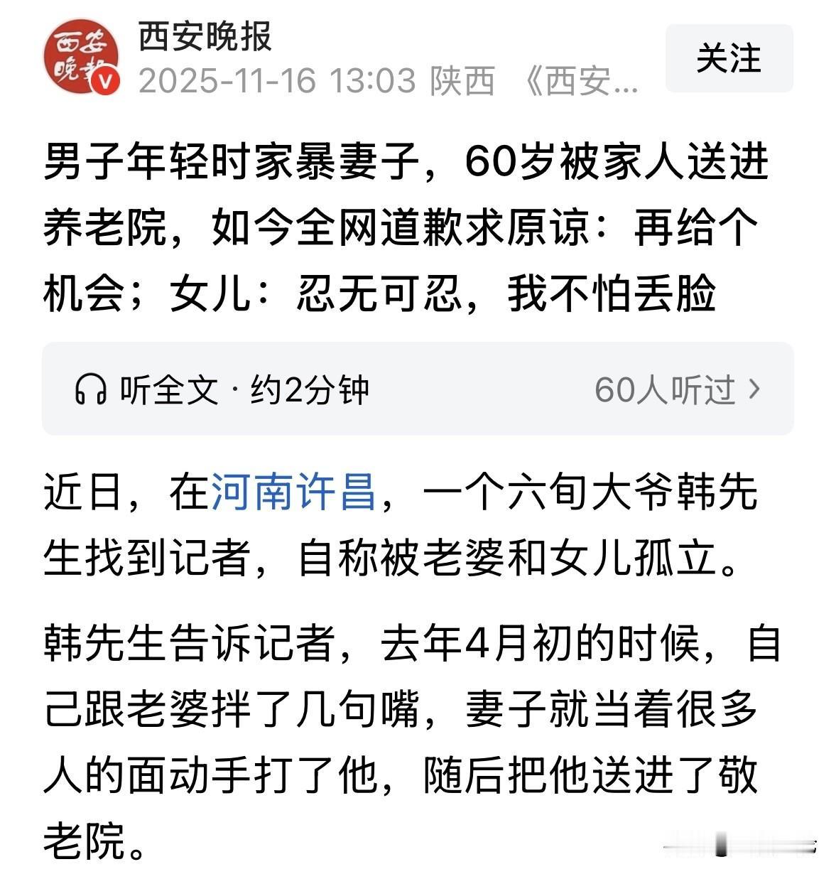 河南许昌,60岁大爷年轻时家暴妻子,酒后拿酒瓶往妻子头上砸,还给女儿打电话,威胁要把母女俩都弄死,如今他老了,折腾不动了,妻子直接把他送去敬老院,每月只给他300块,亲闺女找到他,拿着个棍子就把他轮椅砸了,警告他以后不要再打扰母亲,大爷看自己老无所依,终于后悔,直呼自己知道错了。 最近,60多岁的韩大爷找来了记者,无助地说,他被自己的老婆和闺女给扔了,没人管他了。 事情得倒回去年4月,韩大爷跟老伴儿拌了几句嘴,具体为啥事,他没细说,反正就是老两口日常的磕磕碰碰。 可这次动静大了点。吵着吵着,老伴儿突然动了手,还是当着不少街坊邻居的面,真动了手打了他。 这还没完,随后,韩大爷就被老伴送进了敬老院。 说起这个,韩大爷语气里没有太多愤怒,反倒有点认命的意思。 他跟记者念叨,说我年轻那会儿,脾气暴,打过我老伴不少回。唉,现在人家出出气也应该,让她打两下,我也认了。 他觉得自己年轻时犯的错,现在遭点报应,也算扯平了。 可进了敬老院,头一个月,妻子还给了他600块钱生活费。到了第二个月,钱就减半了,只给了300块。 钱变少了,韩大爷心里更没底了,感觉自己和那个家的联系越来越薄。 他三番五次联系妻子,问她为啥就给这么点钱?后来,亲闺女来找过韩大爷一次,却不是来嘘寒问暖的,而是怒气冲冲地来的。 闺女手里抄着个棒球棍,二话不说,对着韩大爷代步的轮椅就是一通砸。 不仅轮椅被砸坏了,闺女临走还撂下一句狠话:别再回去打扰我妈! 韩大爷坐在被砸坏的轮椅边,心里那滋味别提多难受了,他想不通,这可是亲骨肉啊,咋能这样对他? 记者听了韩大爷的委屈,也忍不住问了个扎心的问题:为啥亲闺女也这样对你?是不是你年轻的时候,真的做了太多对不住她们娘俩的事? 韩大爷被问得有点语塞,最终喃喃地说:我哪点对不住她们了...我改,我真心愿意改。咱还是一家人,行不行? 这话听起来,是真心认错,也是真害怕孤独终老。他坐在轮椅上,行动不便,才真正体会到家人的重要。 记者为了弄清楚真相,拨通了韩大爷女儿的电话。电话那头,女儿的声音中带着愤恨。 女儿说:但凡一个人讲点道理,懂点人事,我们可能在他60岁的时候不管他吗?不可能的!肯定是他做的事太过分,实在是让人忍不下去了,才走到今天这一步。 接着,女儿又说,从我记事起,他就在打我妈妈。不是一次两次,是一直打!喝醉了酒,发起疯来,抓起酒瓶子就朝我妈头上砸过去! 这些画面,成了她童年挥之不去的阴影。更可怕的是,电话里,女儿提到了一件令人毛骨悚然的事。 女儿说,有天我爸喝醉了,打电话给我,电话里说的话,我这辈子都忘不了。他说:我不光要弄死你妈,弄死你妈之前,我得先把你弄死! 对女儿来说,这不仅仅是家暴,更是来自亲生父亲的死亡威胁。 最后,女儿提到了那个让她彻底心死、彻底切断父女情的瞬间。 就在她和父亲最后一次见面的时候,父亲站起来,手里拿着刀,一步步朝她走来...从那一刻起,她就明白了,父亲心里根本没把她当女儿。在父亲眼里,她可能就是仇人。 女儿斩钉截铁地说:我不会管他了,我不怕别人说我狠心,说我丢脸。比起他带给我们的伤害和恐惧,这些都不算什么。 记者把这些话,还有那些往事,都带回了韩大爷面前。 记者也忍不住反问他:你现在坐在轮椅上,行动不便了,觉得自己需要老婆孩子在身边照顾了。可你想想,当你老婆年轻的时候,她们最需要一个能依靠、能讲道理、情绪稳定的丈夫和父亲的时候,你做到了吗?现在你想让她们立刻忘掉过去几十年的伤害,立刻原谅你,重新接纳你,这不大可能。 韩大爷听着记者转述女儿的血泪控诉,听着记者直白的质问,他终于低下了头,说出了可能是他这辈子最真心的承诺。 他说:我永远不可能再骂老婆一句,更不可能动她一个指头了。希望她们娘俩...能给我一个机会吧。我是真的知道错了! 有人说,人们是要为自己的恶行为负责,买单的,这个老汉就要为自己几十年家暴虐待妻子女儿买单的,妻女放弃不管他就是对他最好的报答。 这叫因果循环,种什么因,得什么果。你要用后三十年来还前三十年的债,一年都不能少。 那么,从法律角度,怎么看待这件事? 《反家庭暴力法》第33条规定:加害人实施家庭暴力,构成违反治安管理行为的,依法给予治安管理处罚;构成犯罪的,依法追究刑事责任。 从法律角度看的话,韩先生和女儿的行为都涉及了家庭暴力。 韩先生年轻时长期实施“酒瓶砸头、持刀威胁、醉酒后殴打”等行为,符合对“家庭暴力”的定义。 女儿持棒球棍砸毁韩先生轮椅的行为,可能涉及故意毁坏财物罪。 妻子将韩先生送敬老院的行为,需考察是否符合《老年人权益保障法》第15条“赡养人应履行对老年人经济上供养、生活上照料和精神上慰藉的义务”之规定。 对于这件事,你怎么看? 欢迎关注@一案一论