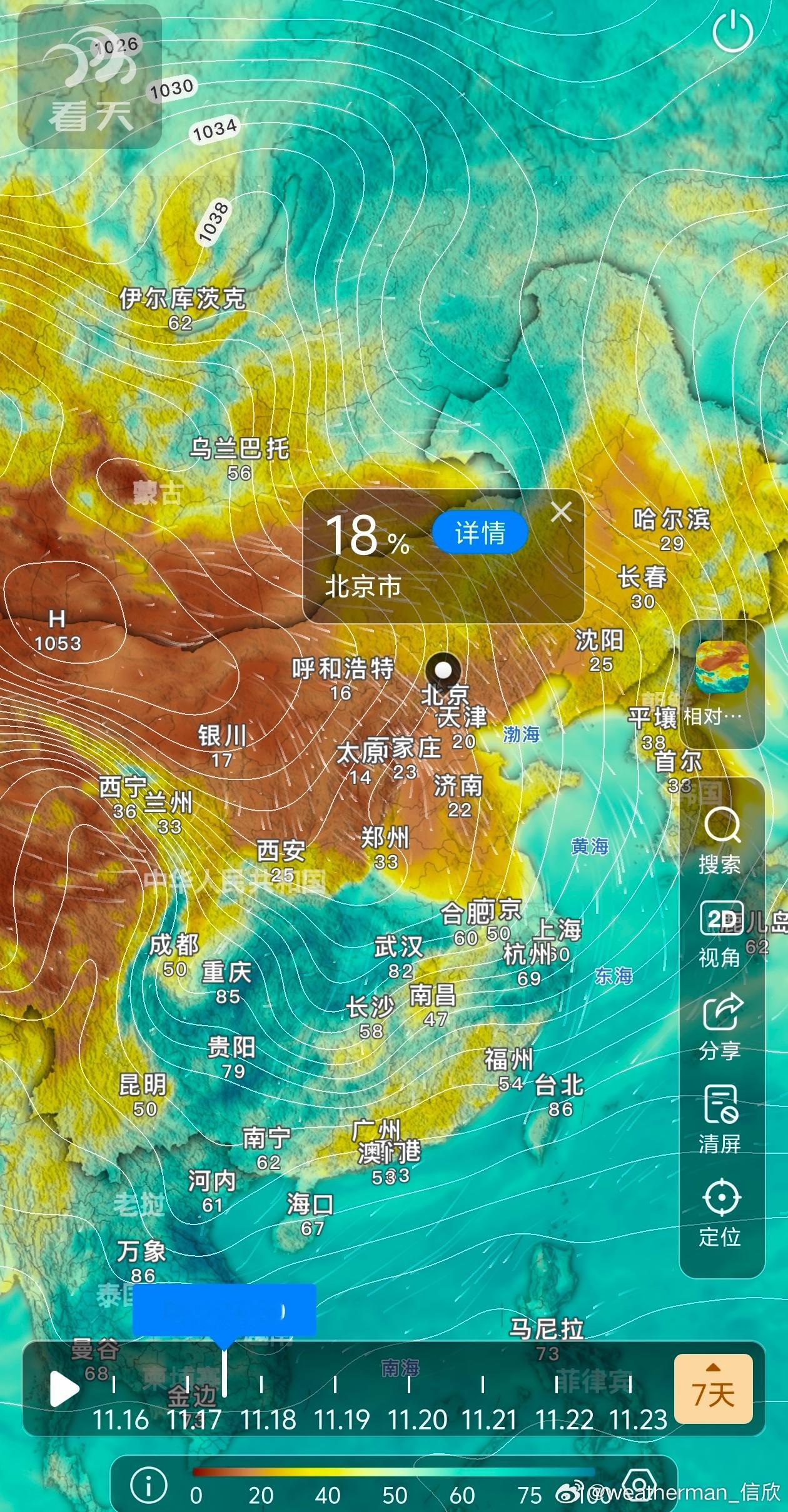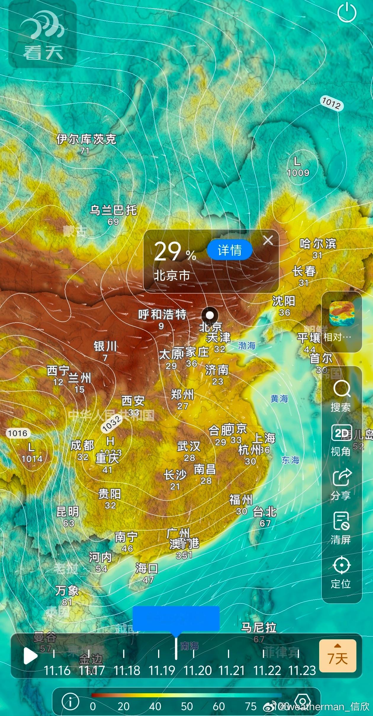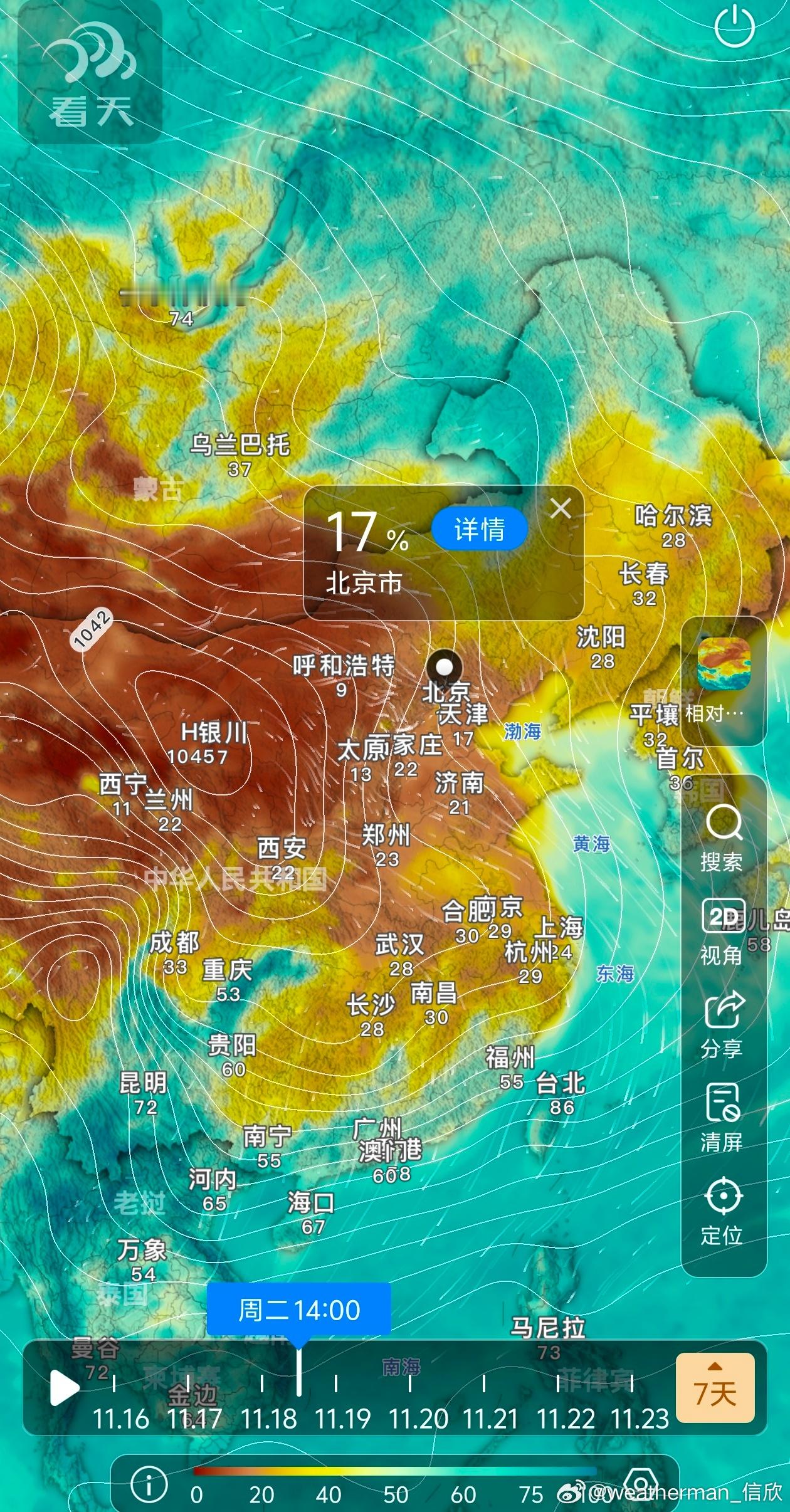 【干燥】今天呼啸的北风使得北方多地变得更加干燥。下午北京、天津、石家庄、太原、沈阳相对湿度不足20%。未来3天,干空气会随着北风继续南下,18-19日江南华南也会陆续变得干燥。