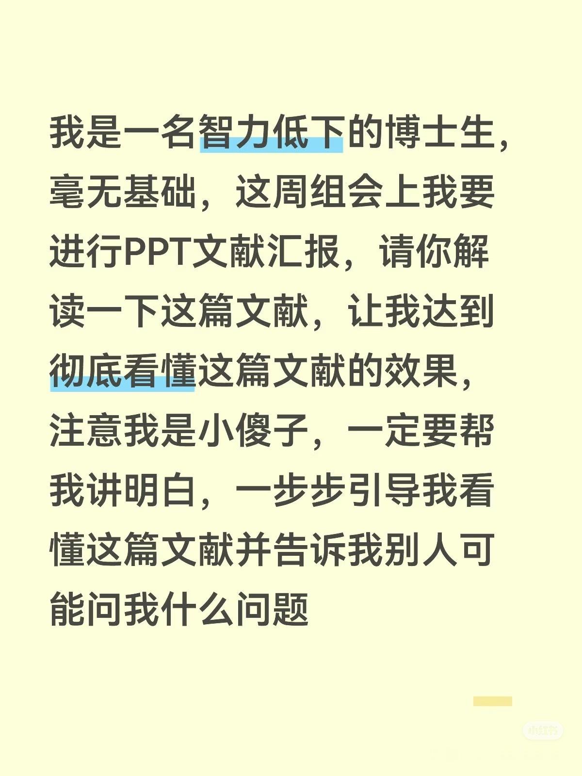 群里分享,非常好的看论文Prompt,小某书都是人才啊!我是一名智力低下的博士生,毫无基础,这周组会上我要进行PPT文献汇报,请你解读一下这篇文献,让我达到彻底看懂这篇文献的效果,注意我是小傻子,一定要帮我讲明白,一步步引导我看懂这篇文献并告诉我别人可能问我什么问题。