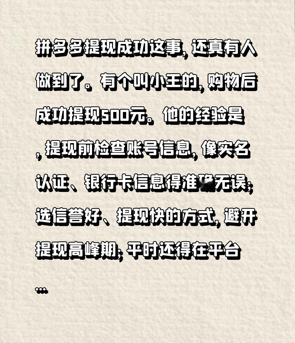 拼多多提现成功这事,还真有人做到了。有个叫小王的,购物后成功提现500元。他的经验是,提现前检查账号信息,像实名认证、银行卡信息得准确无误;选信誉好、提现快的方式,避开提现高峰期;平时还得在平台保持良好购物记录,这样能提高成功率。 不过最特别的“提现”是米哈游法务部。拼多多未经授权用《原神》推广,最后二审被判赔100万。网友调侃,米哈游成了第一个在拼多多“提现”成功的。所以说,普通人按规则也有提现成功可能,而米哈游靠法律手段“提现”也是厉害。