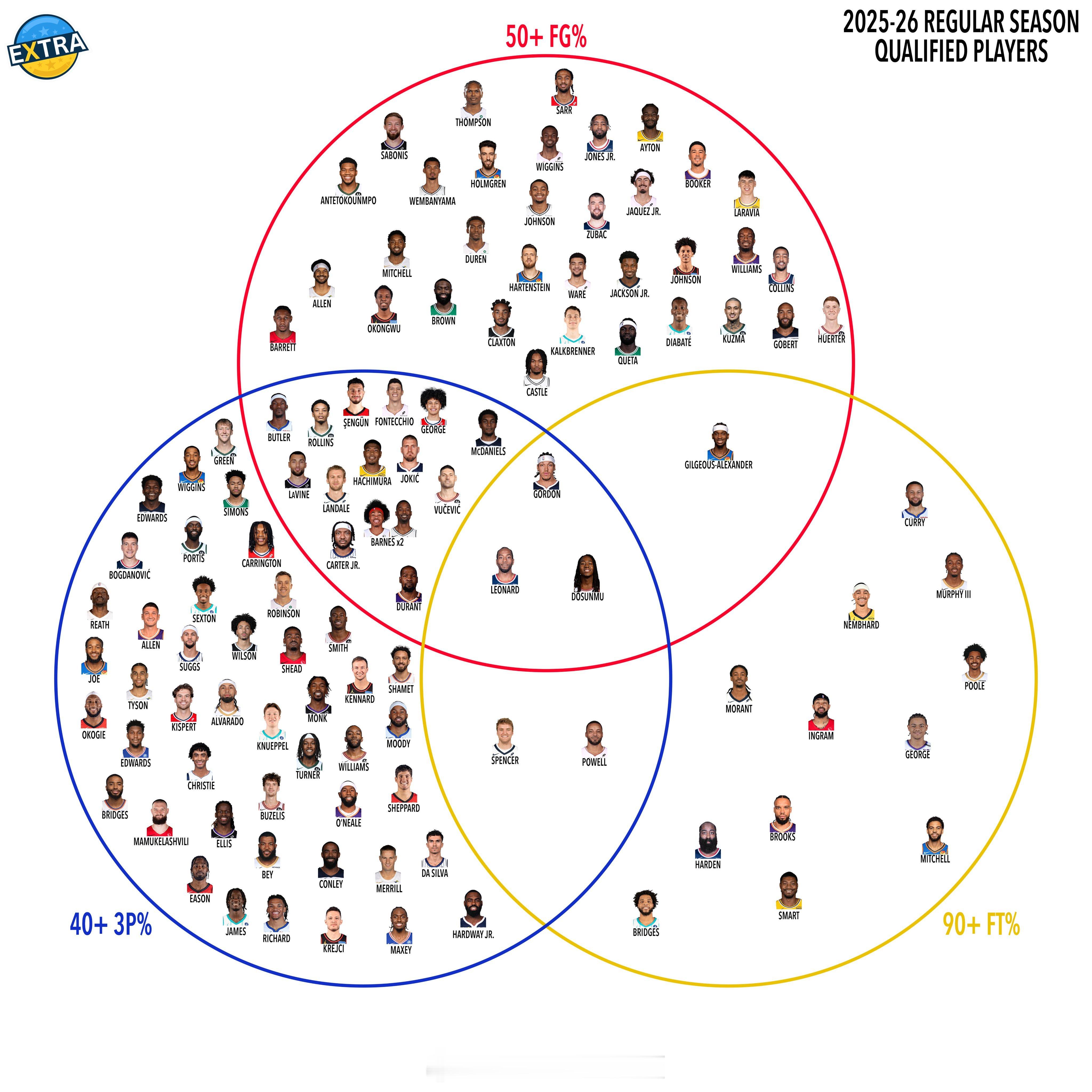 本赛季至今,投篮命中率达到50%、三分球命中率达到40%,且罚球命中率达到90%的NBA球员的完整维恩图。