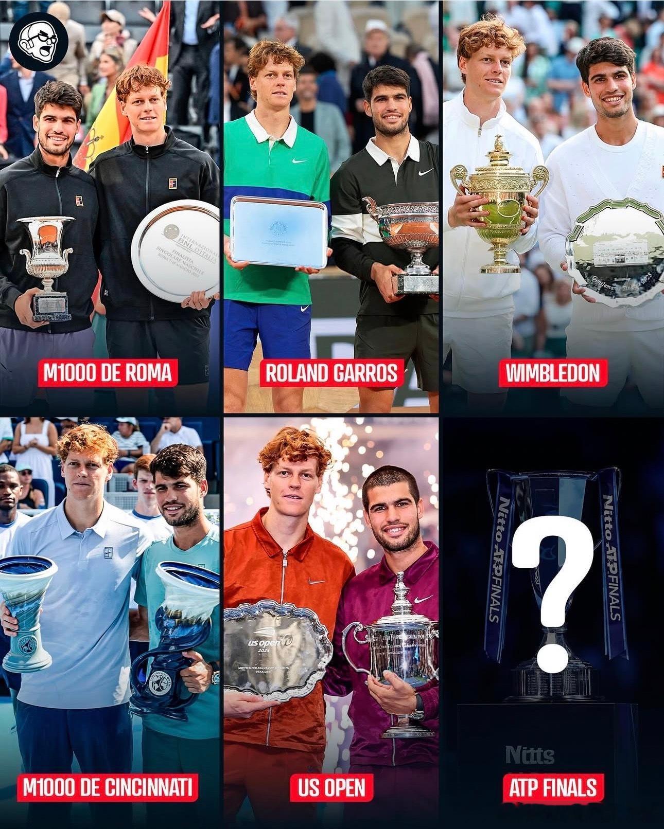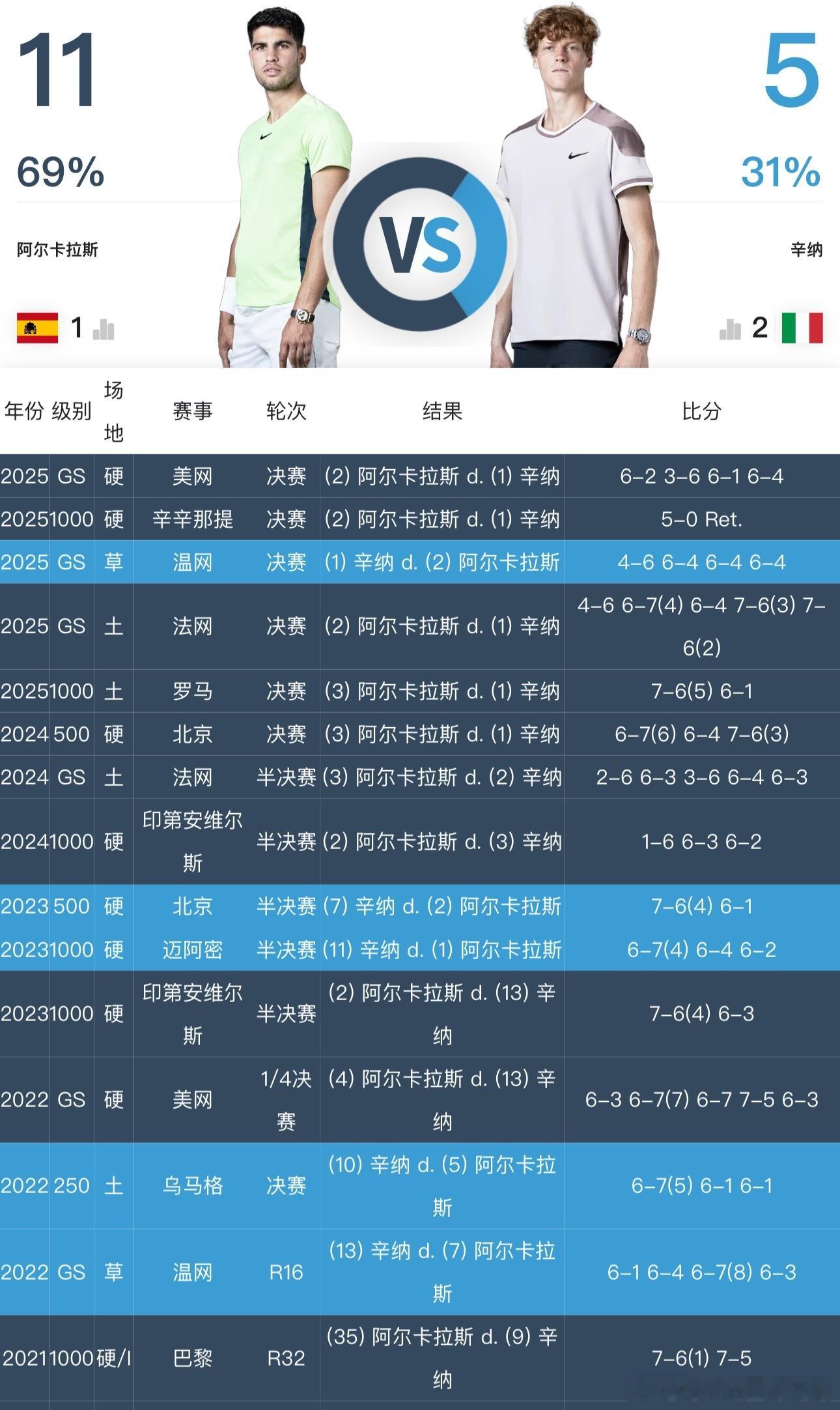 2025收官之战:阿尔卡拉斯vs辛纳今年的最后一场比赛了(比赛时间明天凌晨1点),对阵双方是双子星阿尔卡拉斯vs辛纳,再合适不过了吗阿尔卡拉斯🇪🇸vs辛纳🇮🇹:总得对战记录:1⃣0⃣-5⃣ 7-2 🔵 硬地3-1 🟠 红土0-2 🟢 草地2-1 大满贯决赛5-2 ATP巡回赛决赛4-1今年对阵记录(都在决赛)还有个六王赛决赛,辛纳完胜阿尔卡拉斯,但是不计入交战记录,不过和这场决赛一样是室内快硬;所以谁能最终拿下1500分和507.1万美金的全胜奖金💰?