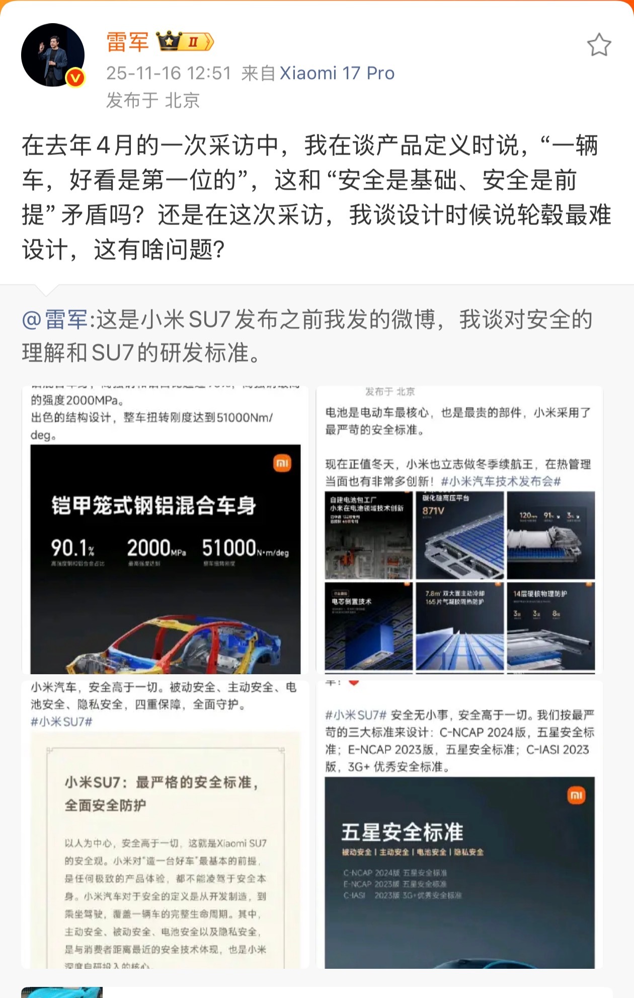 雷总终于坐不住了,网络上乱七八糟的内容太多了,大部分都是断章取义的或者就单纯带节奏。比如雷总说一辆车好看是第一位的,之后的话给你一掐,好!成了小米造车,只为了好看了,小米造车,只研究轮毂了。大家可以看看军儿以前的微博,在第一辆SU7发布前,就宣传安全,并且最近的拆车视频中,各种结构用料都是跨级存在的,这些,都是实打实的“安全”,这些,应该被看见,而不是被yxh们掐头去尾,恶意拼接车如果真有啥问题,该喷喷没毛病,但是如果直接断章取义,甚至人身攻击,那就真没意思了。