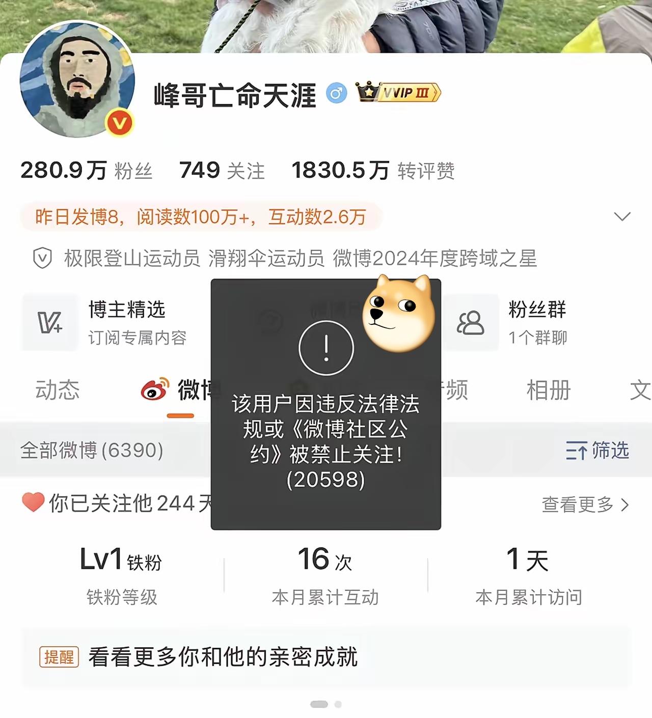 峰哥亡命天涯被全网封禁!临走前晒资产自证爱国,这操作太迷了 谁见过这么戏剧的封禁现场?网红“峰哥亡命天涯”11月14日被全网下架,临走前发微博晒家底自证爱国,还说要冲击珠峰无限期退网,结果转头就被平台实锤封禁,场面属实尴尬。