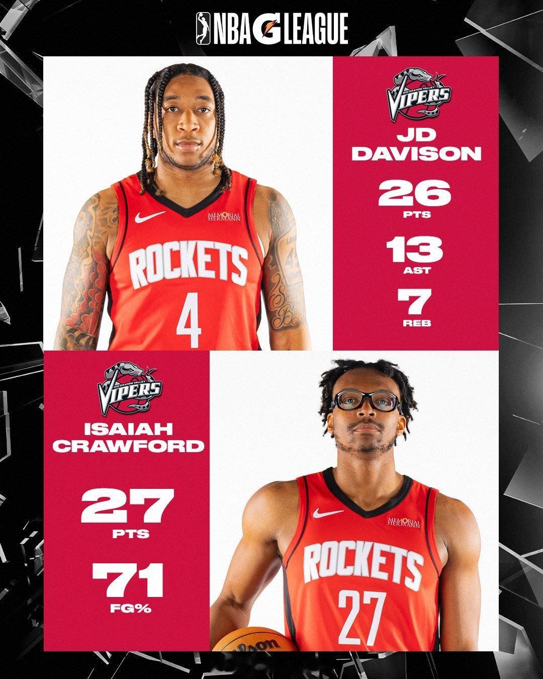 G联盟常规赛,奥格兰德山谷毒蛇133-126击败德克萨斯传奇。效力于毒蛇的火箭双向合同球员JD·戴维森和以赛亚·克劳福德表现出色,分别贡献26分7篮板13助攻,和27分7篮板。