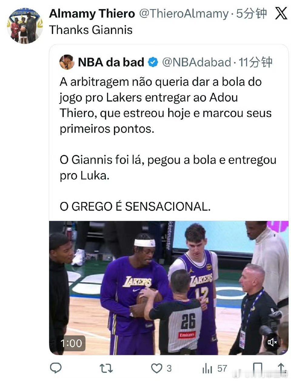 字母哥人品没得说湖人想把比赛用球给阿杜蒂耶罗,但裁判不给,最后是字母哥帮忙拿回来的!阿杜的父亲发文感谢字母哥!